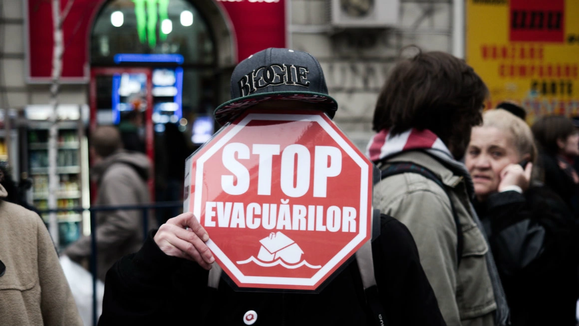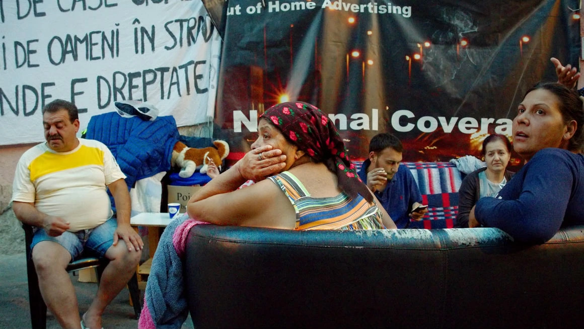 Carton: „În septembrie 2014, o sută de persoane de etnie romă au fost evacuate din casele lor din București. Timp de doi ani, au rămas în stradă ca să lupte pentru dreptul lor la locuire. Aceasta este povestea lor.” Și, în ciuda oricăror prejudecăți pe care s-ar putea să le ai, în ciuda a ceea ce crezi despre tine, despre dreptate și despre muncă, niște istorii similare recente din alte țări europene arată că, la un moment dat, povestea evacuării ar putea să fie și a ta.