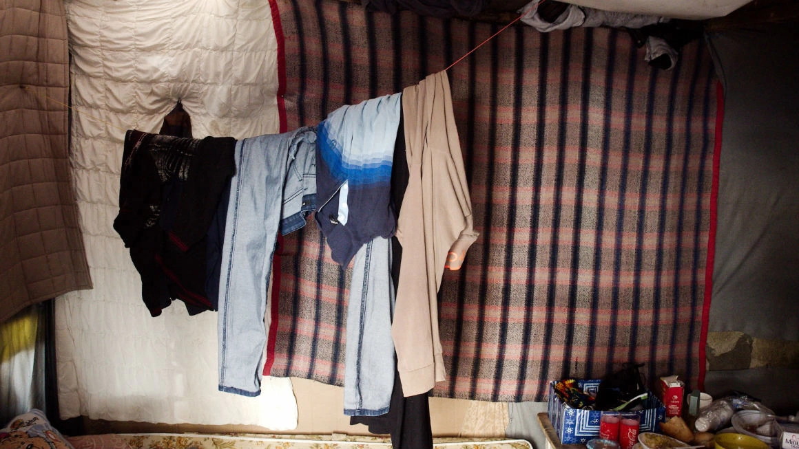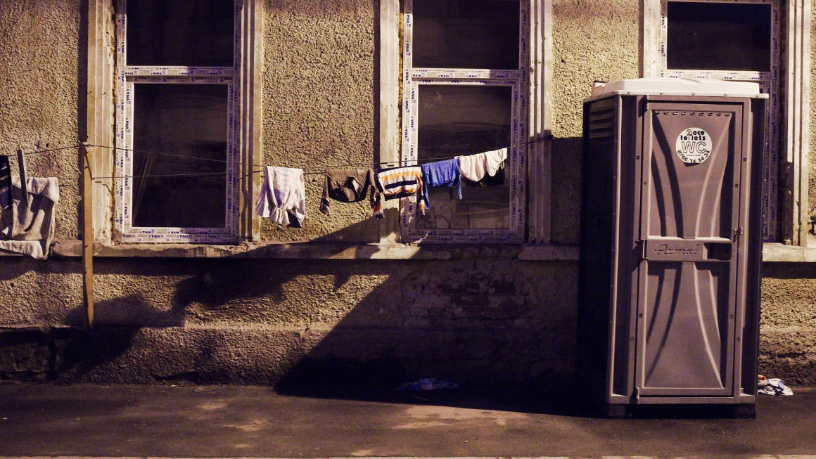 Exterior, București, zi. Prim-plan: o femeie între două vârste, în halat albastru, stă cu fața la cameră, în dreptul unor corturi acoperite cu folie de plastic, puse pe trotuar. „Aici o să rămânem. Ori trăim, ori murim”, spune femeia, fără să privească la cameră. Nu vorbește cu spectatorul, ci cu prezența care o filmează, pe care-o privește direct în ochi. În spatele ei, cu litere roșii pictate pe pânză scrie „EVACUAȚI”.