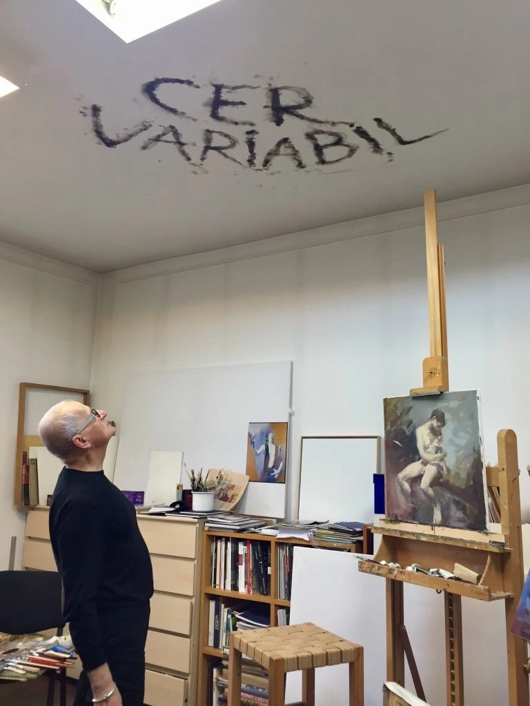 (Râde) Tu ai un ochi format pentru graffiti, te urmăresc pe Instagram. „Cer variabil” e o lucrare care a devenit parte din colecția MNAC, am donat-o, probabil de aceea o tot vezi acolo. Prima dată am făcut-o în pivnița soacrei mele, deci din pivniță a ajuns pe tavanul muzeului. Un indiciu: cum ne raportăm la lucrurile imateriale?