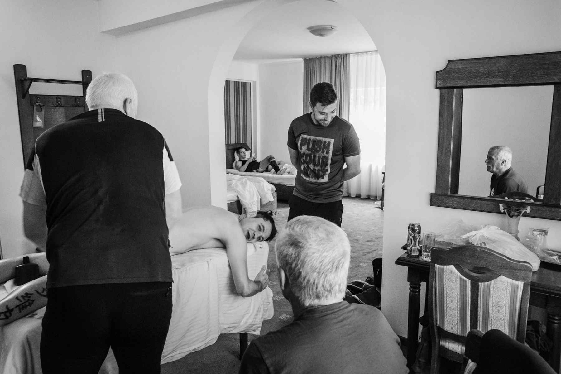 Nu am mai lucrat de mult alb-negru. Prima fotografie din proiect prelucrată alb-negru a venit din încercarea de a tempera lumina neprietenoasă de la amiaza unei zile de vară. Nu puteam să aleg când să fac fotografii ca să am lumina cea mai bună. Majoritatea antrenamentelor erau în timpul zilei, cu un soare puternic. Dar mi-a plăcut cum arăta alb-negru și mi s-a părut că se potrivește subiectului. Și așa a rămas. Nu am dus prea multă muncă de convingere cu mine pe tema asta.