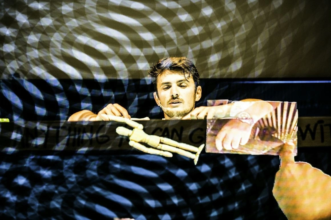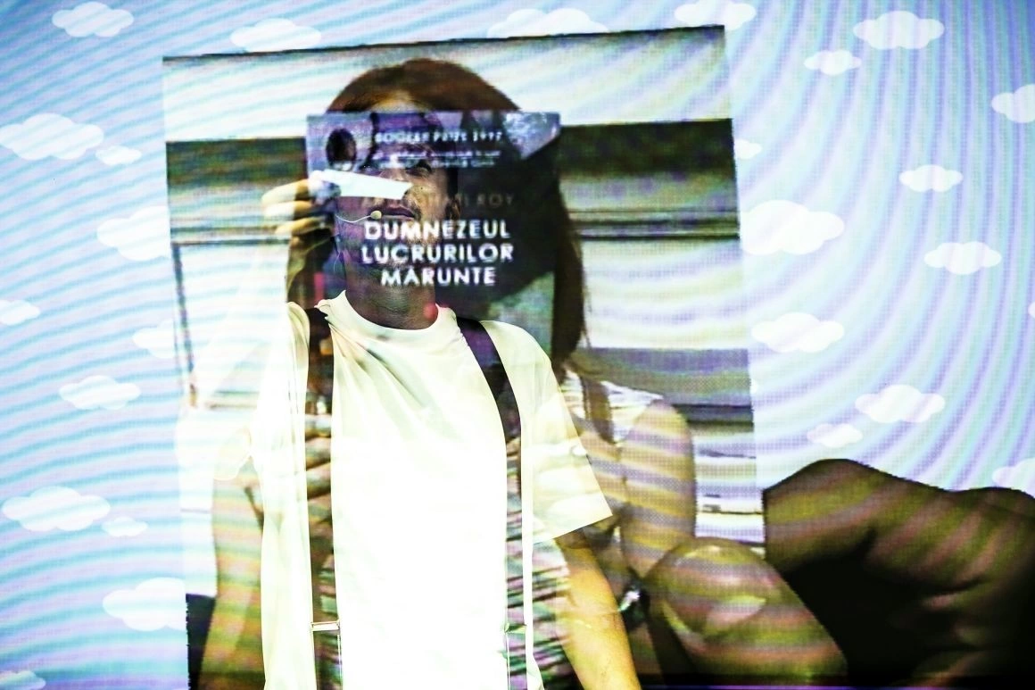 Aş vrea să menţionez decorul realizat de Andreea Simona Negrilă, de o austeritate high tech: un ecran, o masă de proiecţie şi ... două braţe, unul pentru a susţine un pahar cu apă, necesar actorului pentru a face pauze vocale, dar mai ales salturi spectaculoase în naraţiune (instrument dramaturgic de deturnare a atenţiei), altul pentru a susţine o cameră prin care se proiectează fotografiile. Acest al doilea braţ, mai mare şi mai vizibil decât primul, şi care funcţionează ca o metaforă a braţului, este o conştiinţă („ochiul”) trează. Şi uite aşa, am căzut şi eu în capcana căutării semnificaţiei.