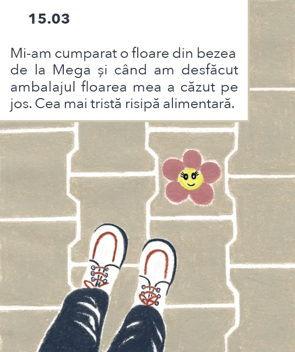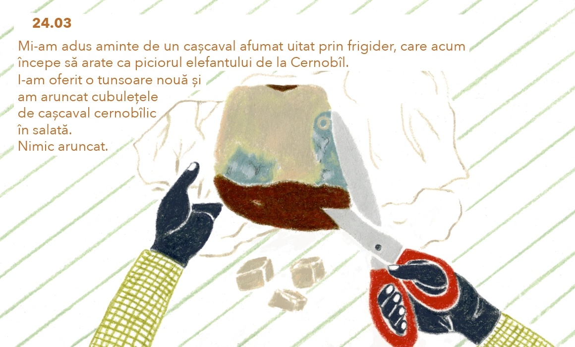 Pentru că plec mâine pe teren, la Arad, pentru câteva zile, am decis să fac curățenie în frigider. Am găsit niște boabe de rodie, care miroseau prea tare a alcool, așa că nu am avut cum să le dau o nouă viață într-un smoothie sau orice altceva mai face Marnela din Cehia pe TikTok. Am mai găsit o jumătate de lime și o cutie cu puțină brânză feta expirată. Cred că mă simt presată de jurnal și mă gândeam dacă să mănânc brânza. „În fond, o am doar de trei săptămâni? E puțin galbenă, dar cine știe?” Am eliminat rapid gândurile pentru că nu voiam să mă pricopsesc cu vreo boală la stomac cu o zi înainte să plec la peste 500 km depărtare de casă. Așa că acea brânză a ajuns la coșul de gunoi