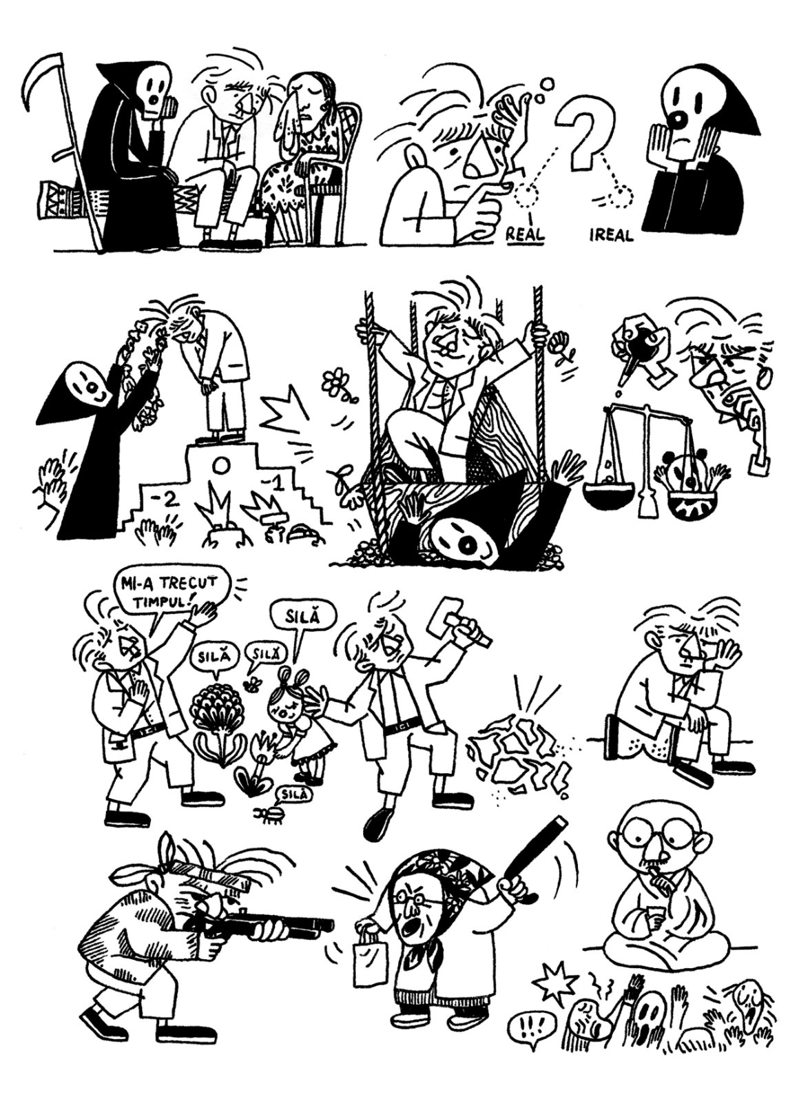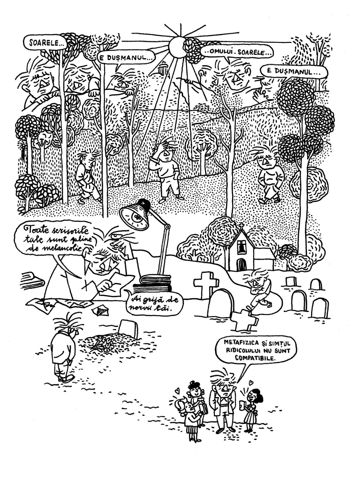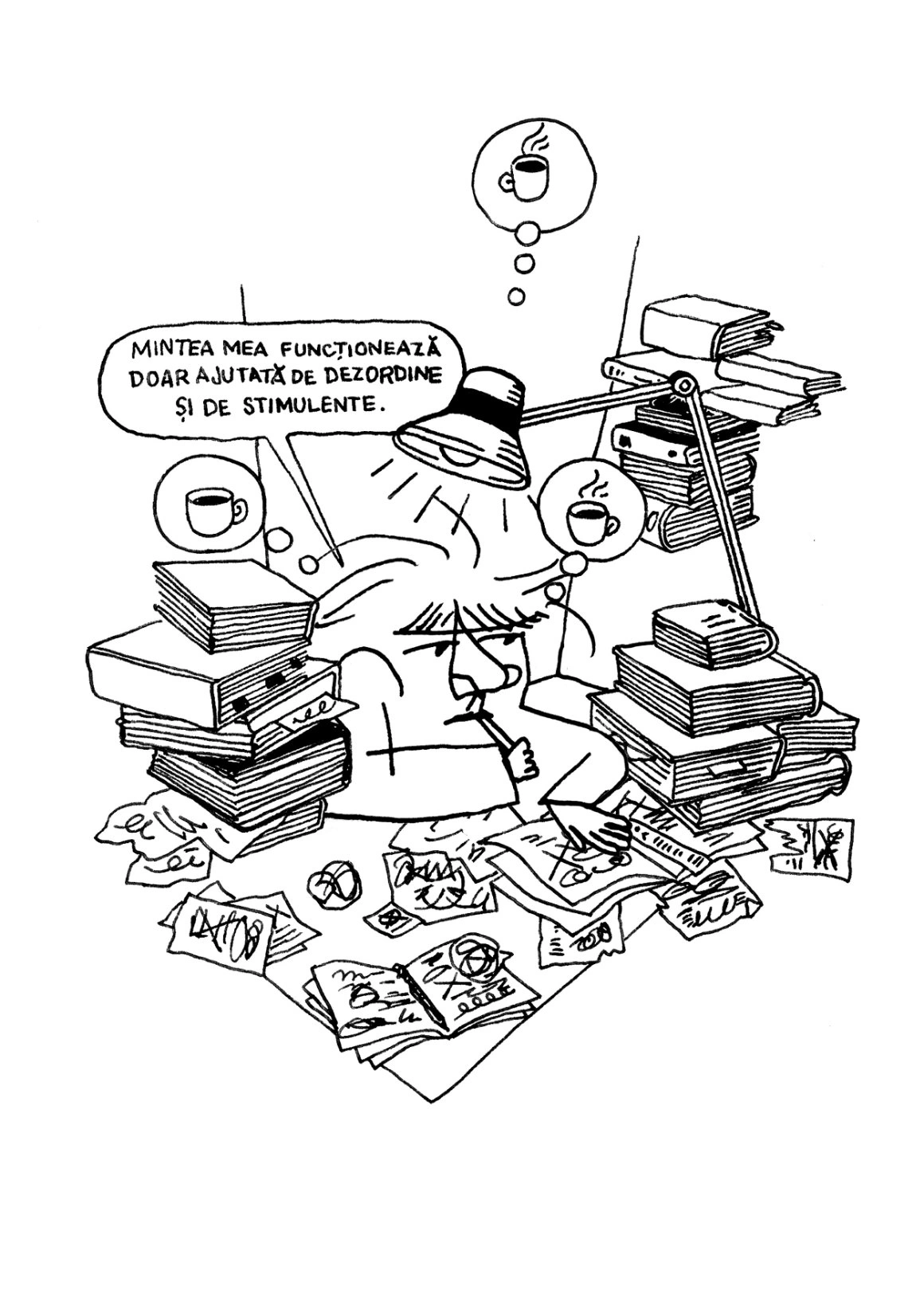 Așa că am concentrat jurnalul în 7 ilustrații, pe care vă propun să le colorăm împreună: le puteți descărca și printa, după care vă scoateți din sertar culorile și (în)locuiți cu ele alb-negrul nihlist. Sau, dacă tot avem sertare fără fund în care zac culori digitale, luați-vă câteva minute de Photoshop. Așteptăm versiunile voastre de Cioran în culori la editorial@scena9.ro sau direct în comentarii. Facem împreună o galerie care i-ar smulge și autorului măcar un zâmbet.