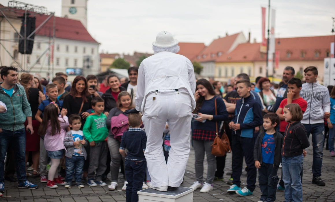 E atât de multă lume și, în orice direcție ai merge, ai senzația că mergi în direcția opusă celorlalți. Fiecare face zig-zag printre copii, bicicliști, turiști străini care atârnă de aparatele foto, mimi, clovni, circari, tonete cu înghețată și scaune de cârciumi. În Piața Mare sunt două scene și o macara lungă cât o șosea, și în fiecare punct cheie e un panou imens cu evenimentele din locul respectiv. Nu pare un weekend obișnuit. Festivalul Internațional de Teatru, laolaltă cu Euro (fie), mână oamenii pe străzi până spre 2 dimineața.