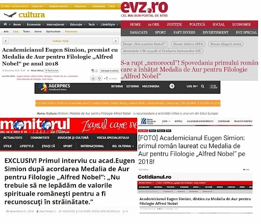 În 2019, Scena9 publica o investigație despre o distincție prezentată drept un „Nobel pentru filologie”, pe care Eugen Simion, președintele Academiei Române la momentul acela, anunțase că urma s-o primească. Potrivit organizatorilor ceremoniei, distincția era acordată de „Societatea Internațională de Filologie” asociată cu o universitate americană din statul Delaware. Publicații românești au preluat știrea și au trâmbițat ca titlu de glorie că, în sfârșit, România are un Nobel: „S-a rupt «nenorocul»” Spovedania primului român care a înhățat Medalia de Aur pentru Filologie «Alfred Nobel»”.