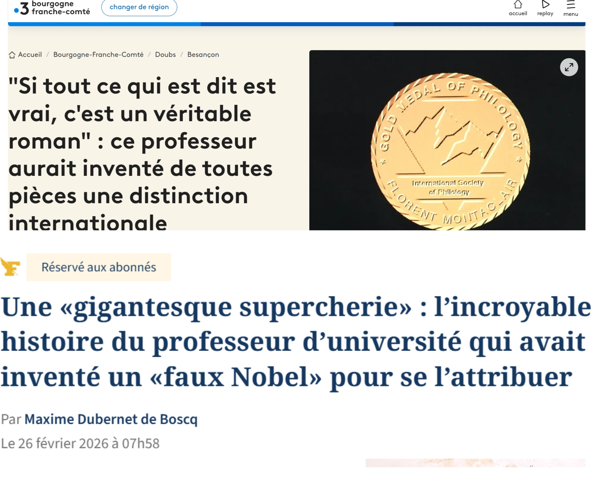 În februarie 2026, presa regională din Franța, în special ziarul L’Est Républicain, a publicat o serie de investigații despre cazul Montaclair: „Investigație asupra unei farse: A inventat acest profesor universitar un «Premiu Nobel» pentru el însuși?”. Multe citează explicit investigația Scena9 din 2019 drept primul moment în care existența medaliei a fost pusă public sub semnul întrebării.