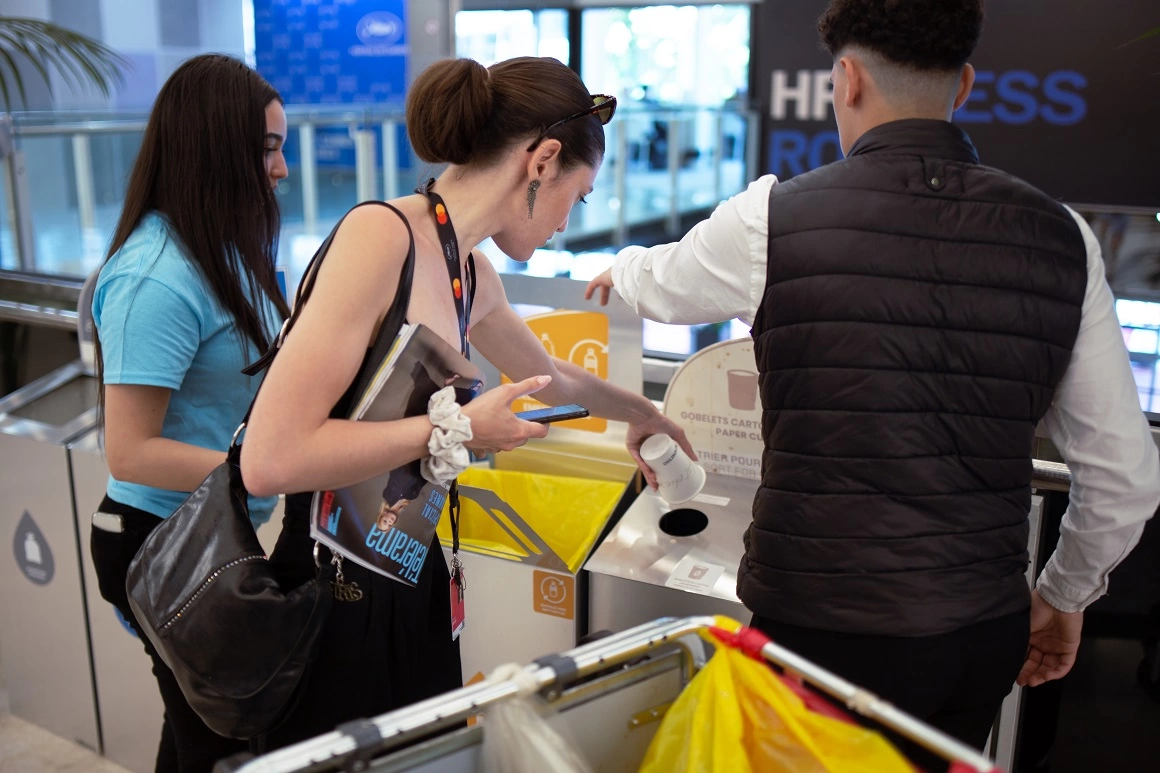 Un lucru care a fost într-adevăr eliminat este apa îmbuteliată în sticle de plastic. Mai mult, a fost înlocuită cu fântâni de apă potabilă amplasate în diverse locuri din Palatul Festivalului, o schimbare salutată de participanți. Impactul recipientelor de unică folosință nu a fost, însă, redus la zero. Pahare de unică folosință nereciclabile erau în continuare la dispoziția acreditaților, atât pentru apă, cât și pentru cafea. Acestea ajungeau deseori în sacii pentru deșeuri reciclabile, deși paharele pentru cafea sunt contaminate și au o folie din plastic care le face nepotrivite pentru reciclare.