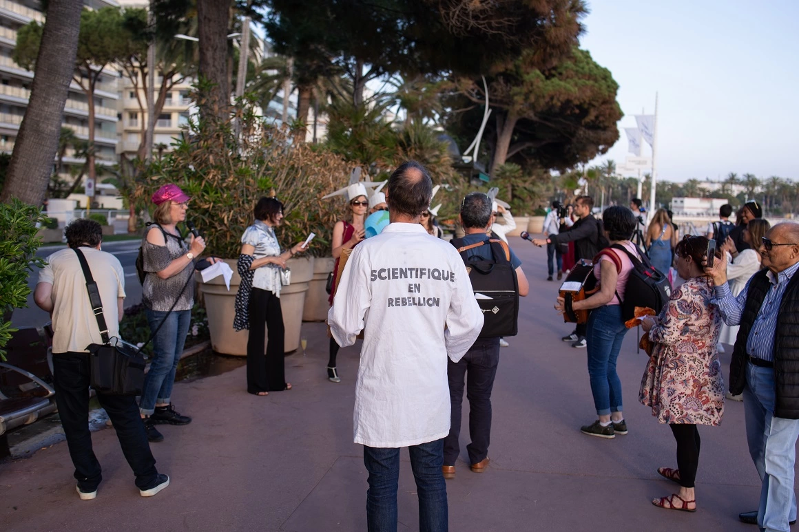 La capătul celebrei Croisette, faleza care se întinde de-a lungul celor mai luxoase hoteluri din Cannes, un grup de vreo 10 oameni se organizează pentru un flashmob. Sunt profesori și cadre asociate de la Universitatea Côte d’Azur din Nice, afiliați grupului Scientifiques en Rebellion, o mișcare a universitarilor care protestează împotriva abuzurilor de mediu și care s-a concretizat în grupuri de acțiune în mai multe țări. Cei din Nisa au o vechime de maxim un an, iar membrii de pe faleza din Cannes sunt la unul dintre primele lor proteste. Guillaume, profesor în departamentul de informatică, spune că nu e ușor să ieși din zona de confort și să te expui public, dar criza climatică este o miză prea mare și simte că trebuie să iasă din laborator.