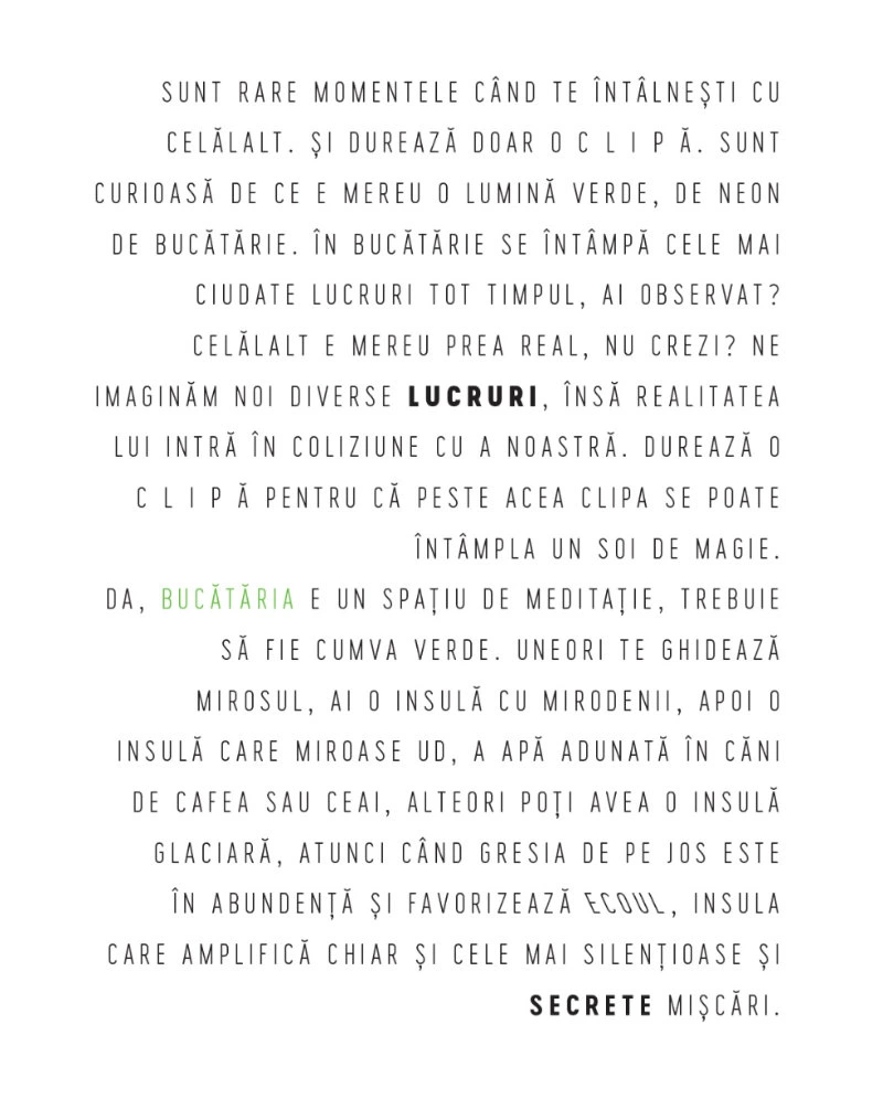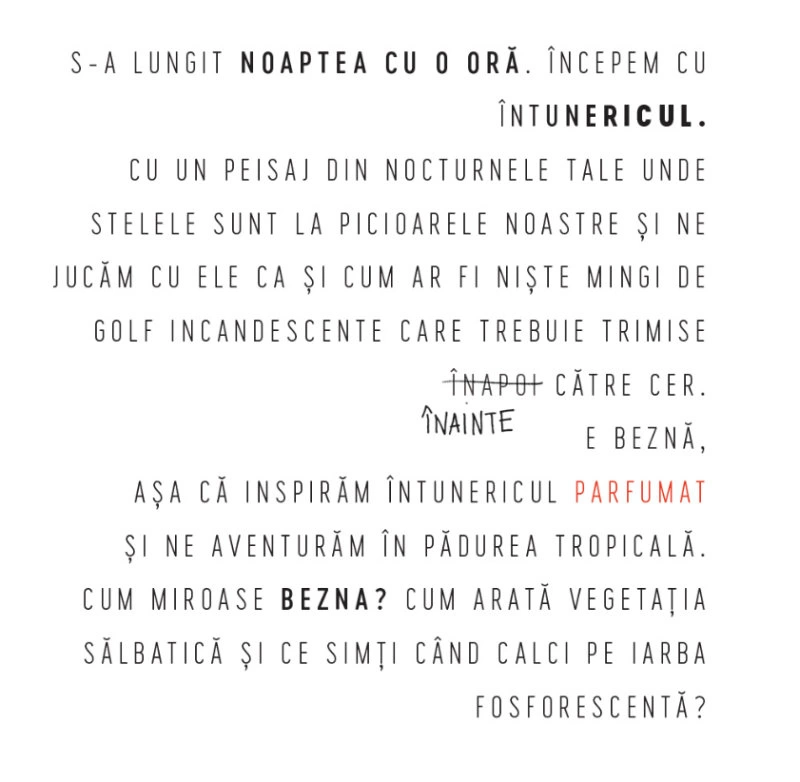 Textul a fost o serie de scrisori în mare parte nocturne, cu câteva punctări esențiale diurne, între mine și Diana Marincu. Un text aproape somnambul, pe un alt palier de logică, ghidat după orice altceva în afară de viața care se desfășura înaintea mea, chiar atunci: sala de așteptare a unei policlinici, scara blocului părinților mei, rătăcirea printre raioanele perfecte ale unui magazine de bricolaj.