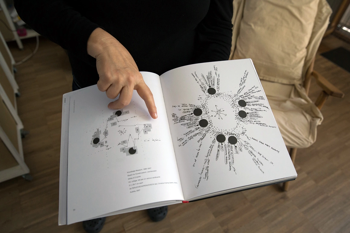 Instalațiile mele sunt ca niște desene în spațiu. Privitorul se mișcă în spațiu și se mișcă printre elemente. Nu e numai documentare și nu e numai o poveste despre cum am construit eu Arhiva. E un „reading room”. E formula unei cercetări. Sun ziarele mele, desenele mele, picturile mele. Astea sunt variantele Muzeului Cunoașterii. Eu călătoresc cu ele-n geamantan. Neavând o instituție în spate, să-mi asigure ajutorul necesar, asigurările și transportul, mi le duc singură. Ele sunt mici, dar în expoziție devin mari, sunt gonflabile sau sunt telescopice, folosesc diagrame, cărți, mai cumpăr obiecte la locul respectiv. E citată cumva școala sau laboratorul. Uneori, eu mai spun că sunt Mary Poppins. Mă duc cu geamantanul și scot expoziția din el.
