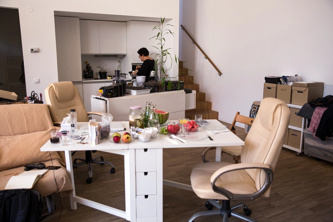 Casa în care se află Arhiva de Artă Contemporană și Muzeul Cunoașterii nu e nici pe departe un spațiu formal, cu vitrine și etichete, ci un loc cosy, unde viața de zi cu zi își lasă urmele mici. Într-un colț, niște valize gata oricând să fie umplute cu bucăți din Muzeu și duse spre expoziții din cine știe ce orașe îndepărtate, unde vor recrea, într-o încăpere, pe un zid, într-un colț sau pe o masă, câteva noduri din rețeaua cunoașterii, așa cum și-o reprezintă Lia. În același timp, spațiul ăsta e și locuința celor doi artiști, și cu toate astea, semnele vieții domestice sunt în minoritate. Bucătăria deschisă chiar în fața rafturilor unde se află arhivele seamănă mai mult cu o convenție din teatru, spune Lia, care, pentru o vreme, a lucrat în anii ’80 ca scenograf. Într-un fel, masa unde, la ora prânzului, ne-așezăm și mâncăm orez chinezesc și zacuscă, e un alt departament al Muzeului, unde se întâmplă toate ritualurile vieții de zi cu zi. Unde se face ceaiul pe care-l bea Lia Perjovschi înainte să lucreze la conceptul unei noi expoziții și cafeaua pe care-o bea Dan Perjosvchi, înainte să concentreze într-un desen cea mai încâlcită criză socială a momentului.
