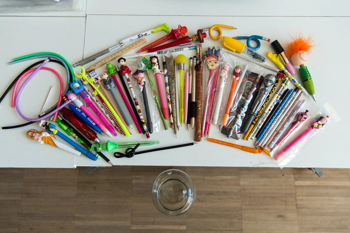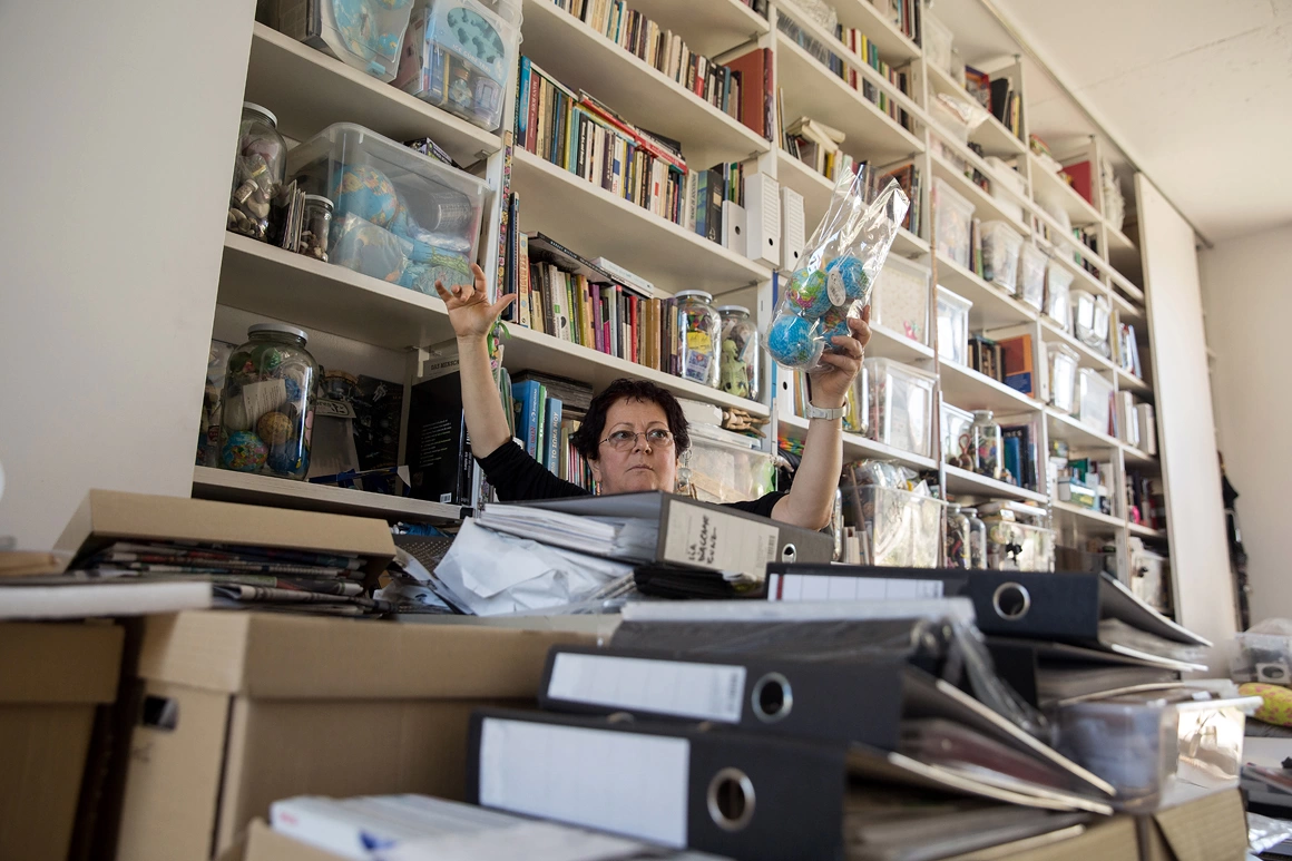 „Context” e unul dintre cuvintele pe care Lia le folosește foarte des, iar arta ei ilustrează profund înseamnă acest cuvânt. Nu doar despre ce presupune să fii artist din estul Europei sau sau cetățean într-o societate în tranziție, ci ce presupune să fii un colocatar al planetei. Așa că, după Arhiva de Artă Contemporană, a creat un Centru de Analiză, iar de la finalul anilor ’90, a început să colecționeze primele obiecte din ceea ce avea să devină Muzeul Cunoașterii, lucrarea care a ajuns să-i ocupe azi mare parte din casă și din care se desprind multe din expozițiile ei. „Primul obiect care era din altă direcție a fost o umbrelă cu stele - am cumpărat-o în Italia, la Palazzo Grassi, unde era o expoziție despre cosmos în secolul 19”. Acum, umbrela aia e ruptă și stă cuminte într-o colecție mai mare de umbrele. În altă călătorie, a găsit un glob pământesc cu picioare și așa s-a apucat să facă o colecție de globuri, inclusă acum la departamentul Pământ al Muzeului. Globurile astea erau pentru ea „un instrument serios de călătorii imaginare”, dar și-un simbol foarte bun pentru toată pofta cu care voia să înghită toată cunoașterea pământului. În cei aproape 20 de ani de când construiește, bucată cu bucată, instituția do it yourself a muzeului, au apărut celelalte șase departamente miniaturale, din cărți, jucării și suvenire alese strategic. Borcanele cu creioane, de altfel, nu sunt doar un inventar cu obiecte de scris, ci un inventar al imaginarului nostru de pământeni ai lui 2017. Un creion cu Isus stă lângă un pix cu cap de extraterestru și lângă ele, unele cu figurine Disney. La fel ca-n malaxorul de informații din care ne luăm doza aproape non-stop.