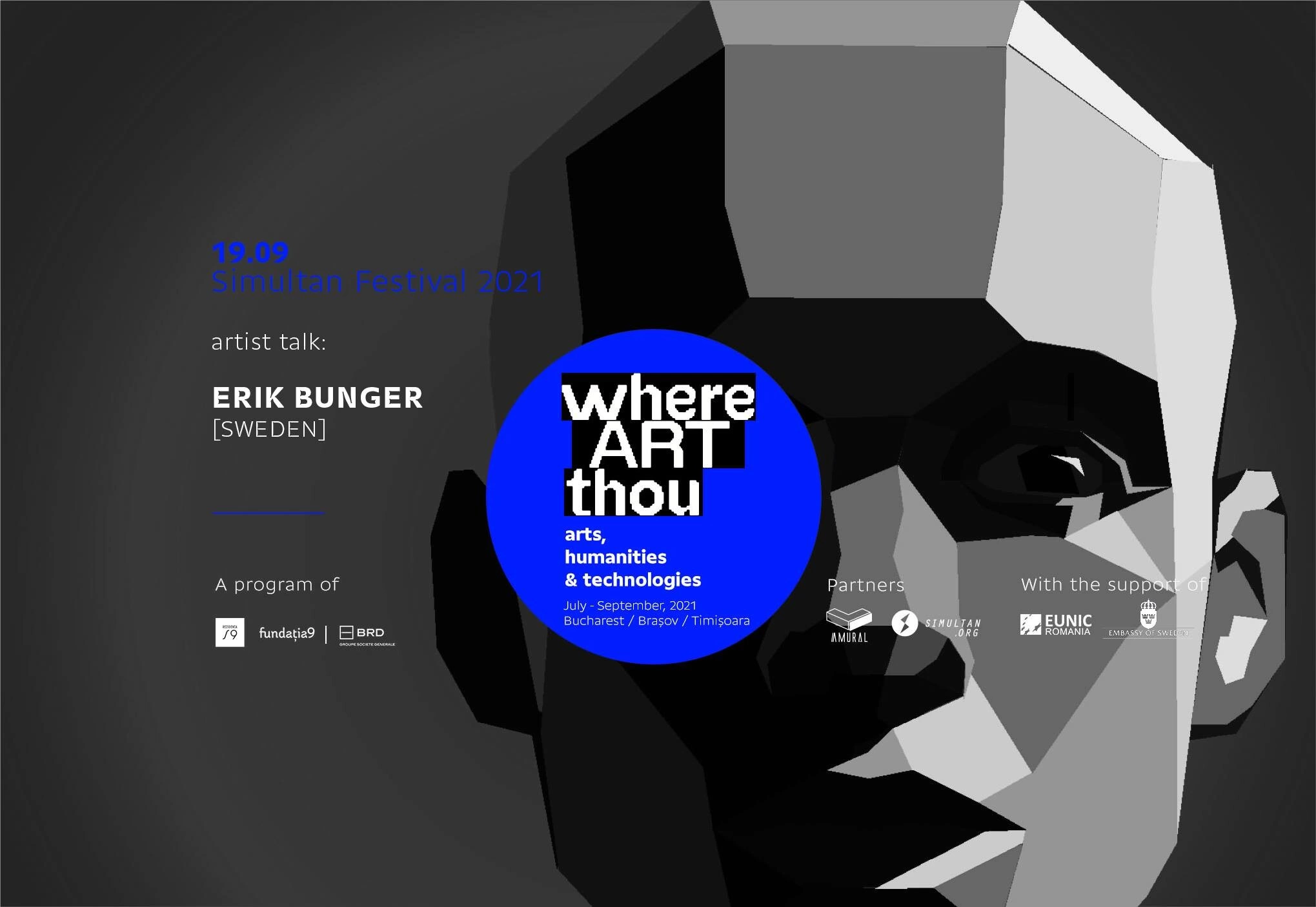 Programul de conferințe despre cum tehnologia ne schimbă cultura și arta, Where ART thou?, continuă și în afara spațiului Rezidenței: joi, 16 septembrie, cu Răzvan Pascu, co-fondator Amural: Light Art: Public Space, Art & Technology (Pavilion 32, Goethe-Institut București) și în cadrul Simultan Festival (Timișoara, 11 - 19 septembrie 2021), cu conferințele artiștilor Ewa Justka din Polonia, pe 13 septembrie și Erik Bünger din Suedia, pe 19 septembrie.