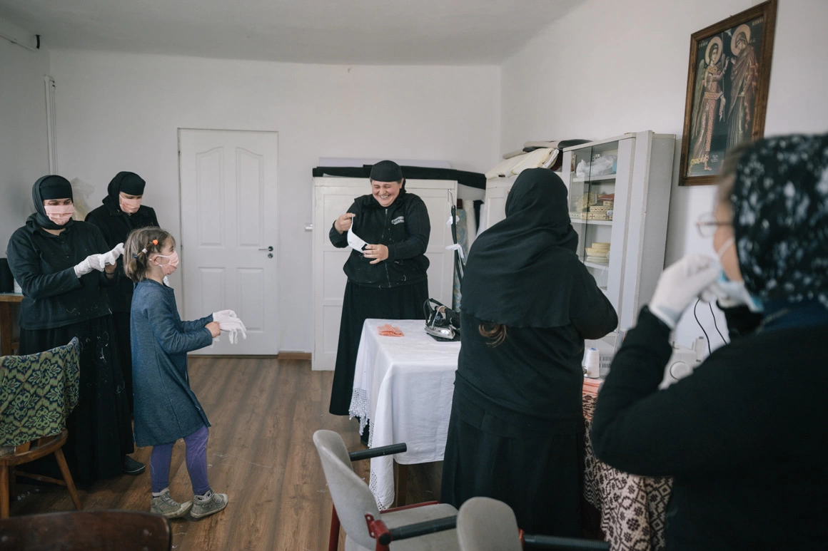 Întâi au pregătit peste 200 de pachete cu mâncare caldă pentru cei care lucrau în punctul de trecere a frontierei Nădlac II, pentru medici, asistente, polițiști, jandarmi. Apoi au reprofilat atelierul de croitorie de la schit, unde făceau veșminte bisericești, și au început să confecționeze măști de protecție și cearșafuri pentru paturi de spital. Reușesc să coasă cam 200 de măști pe zi, pe care le donează. Când sunt gata, sunt preluate de arhiepiscopie, care le duce la spitale, cabinete medicale și la persoane nevoiașe. Cearșafurile ajung la spitalul din Ineu, greu încercat de COVID-19.