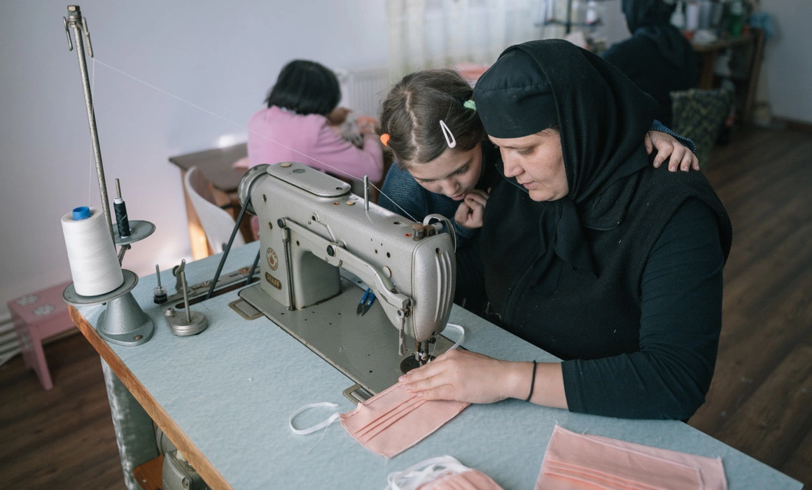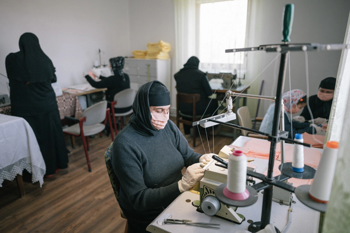 Într-un capăt al clădirii cu un nivel, străjuită de un coridor lung cu arcade, din spatele unei uși albe de lemn, se aude bâzâit de mașini de cusut. Când a izbucnit molima, măicuțele, obișnuite cu războiul nevăzut, n-au stat cu mâinile în sân și au scos degrabă icoana Maicii Domnului cu Pruncul, pe care o poartă în fiecare zi în procesiune în jurul bisericii, ca să se roage pentru însănătoșirea celor bolnavi. Dar maica Serafima, stareța schitului, maramureșancă hotărâtă, știe că pomul bun după roadele sale se cunoaște și că nu e bine să ispitim pe Domnul, să așteptăm doar minuni din partea sa. Așa că s-au pus pe treabă.