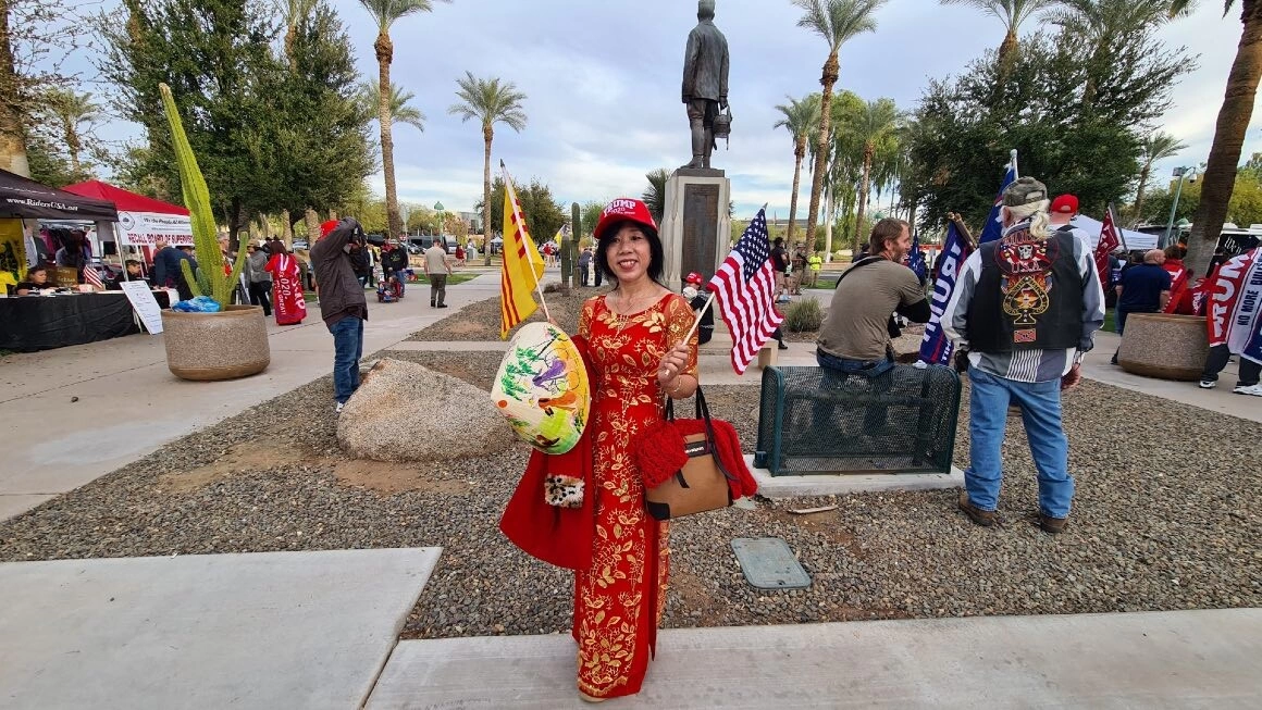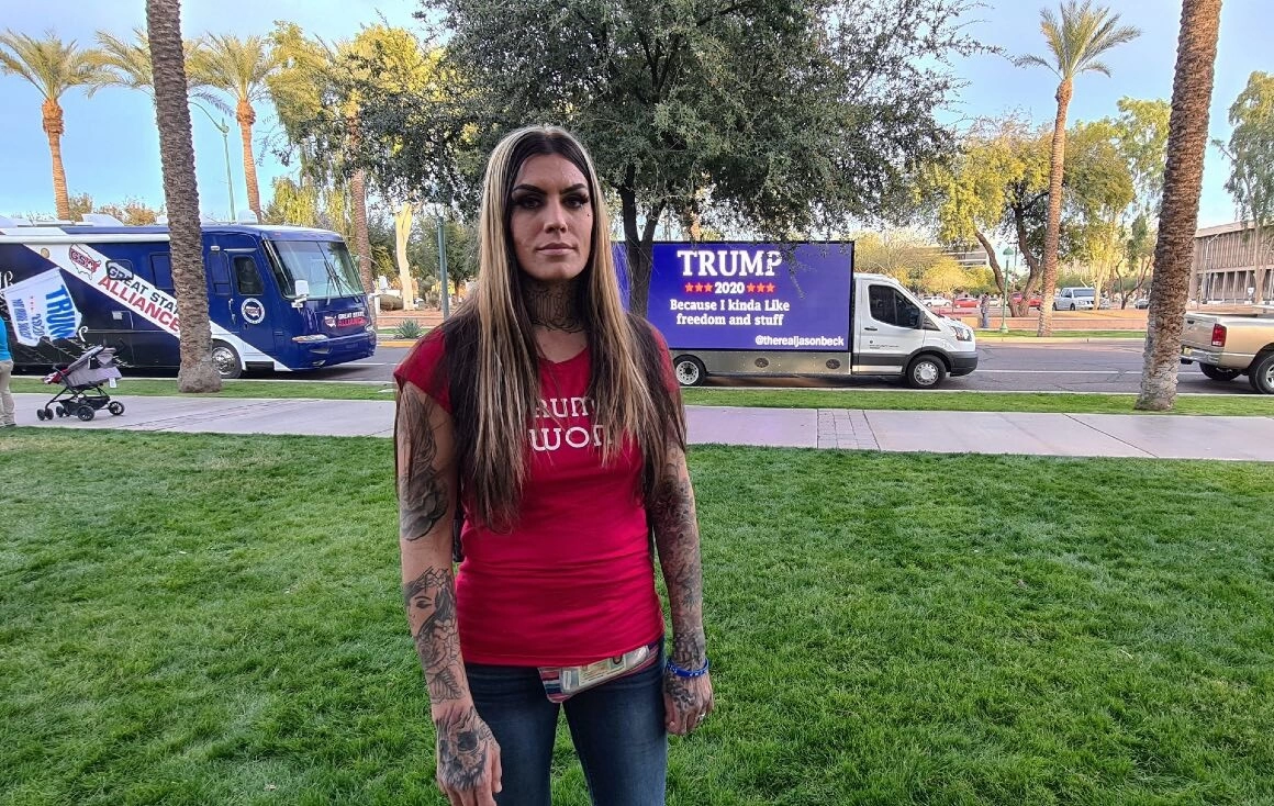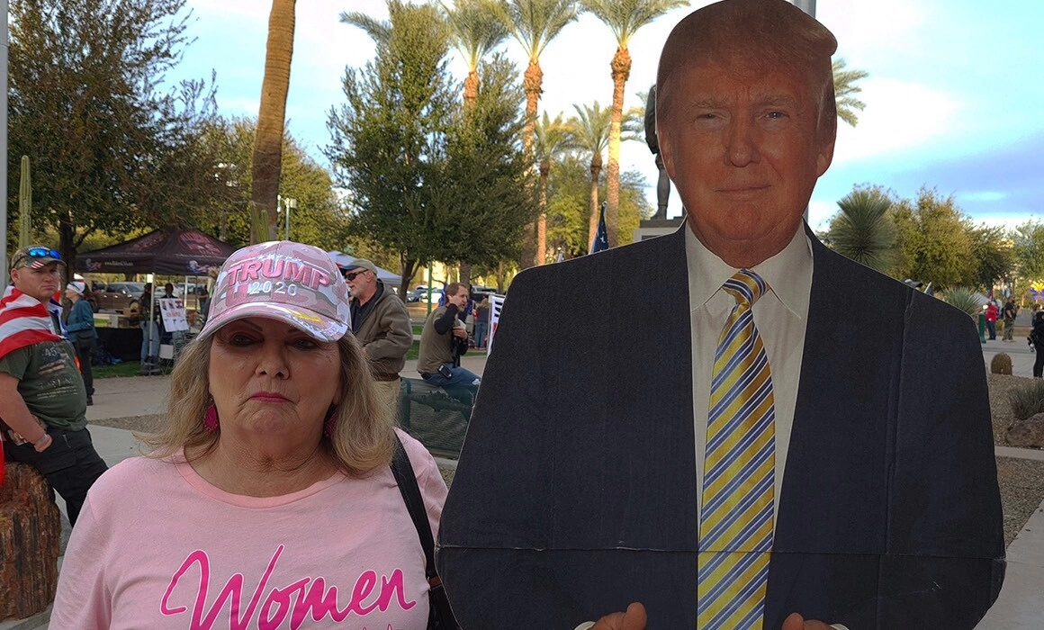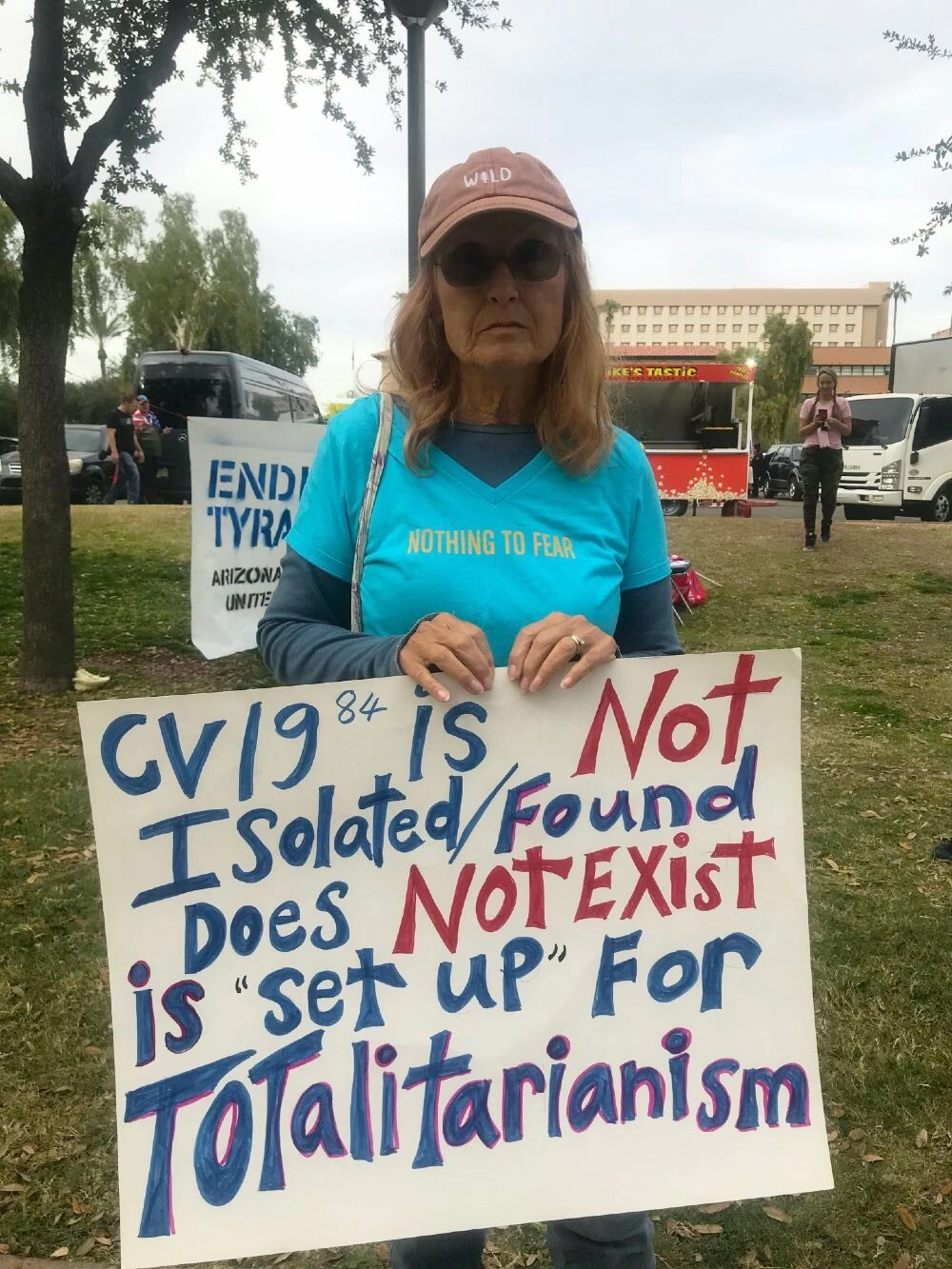 Lumea flutura steagul Americii și pancarte cu mesajele Salvați Republica noastră, Dumnezeu să binecuvânteze America, Integritatea alegerilor contează, Opriți globalizarea sau Cea mai mare amenințare pentru această țară e să credem că altcineva o va salva. Mai nimeni nu purta mască, iar unii își dădeau trabucul de la unul la altul, deși Arizona e statul cu cea mai mare rată de îmbolnăviri cu COVID-19 din SUA.