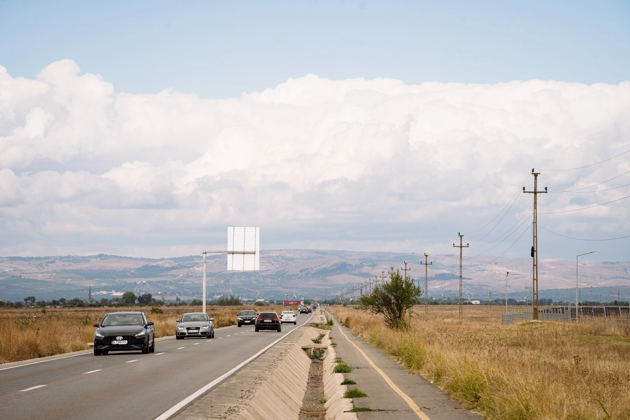 Traficul se rărește înspre ieșirea din oraș. Câmpul prin care iese autostrada din București e ceva magic – munți de moloz, șoimi, stâne de oi și vile duplex de sute de mii de euro. Acum zece ani erau doar oile. Peste încă zece ani vor fi doar duplexurile. Autostrada A3 începe bine, cu trei benzi, apoi retrogradează la standarde românești: două benzi, una pe care merg cu 90 la oră TIRuri și mașini care n-ar trece ITP-ul nici în vis și a doua, pe care merg șmecherii cu 150. Pe la kilometrul 20, un cetățean culege tacticos de pe autostradă cutii de IKEA. Merge agale printre mașini și le ridică, i-au zburat din remorcă. Un pic mai sus, prietenii lui George Simion au scris „sfinții închisorilor canonizați” pe un pod. Sub pod a oprit un cetățean pe avarii, se pișă. Autostrada A3 nu are toalete sau parcări deocamdată; cică va avea.