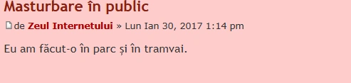 „M-am masturbat oriunde se putea. La scoala in toaleta, in vestiarul fetelor la sala de sport pe pantofii si ciorapeii lor, in sala de clasa langa colege mai ales vara cand aveau picioarele goale”. „M-am masturbat in mare, la Mamaia”. „Am facut laba in tramvai. De doua ori”. Acestea sunt doar câteva dintre postările în care administratorul forumului relatează astfel de episoade.