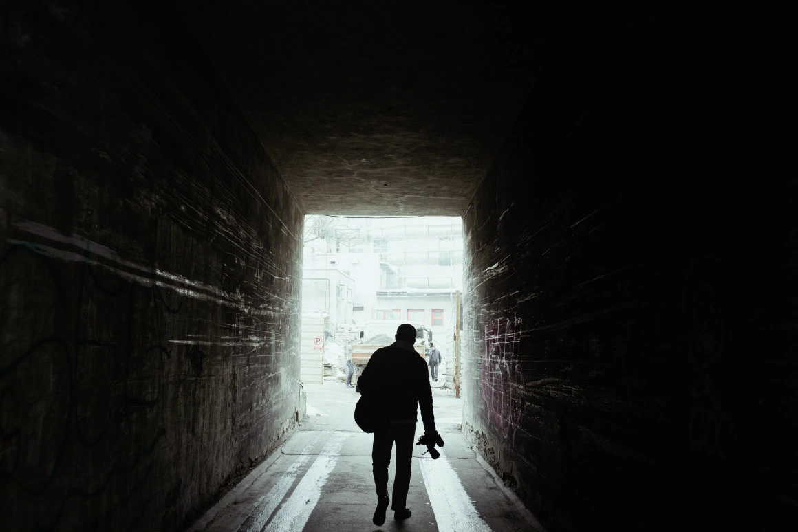 Simte cum i se dislocă coloana vertebrală. Stau om la om în câțiva metri pătrați și fiecare împinge. „Imaginează-ți: oameni disperați de arderi, sute de grade deasupra ta, împing toți să iasă”. Deși îi fusese cald tot concertul, a rămas în sacou, ca să-și țină în buzunar acumulatorul și cardurile de la cameră.