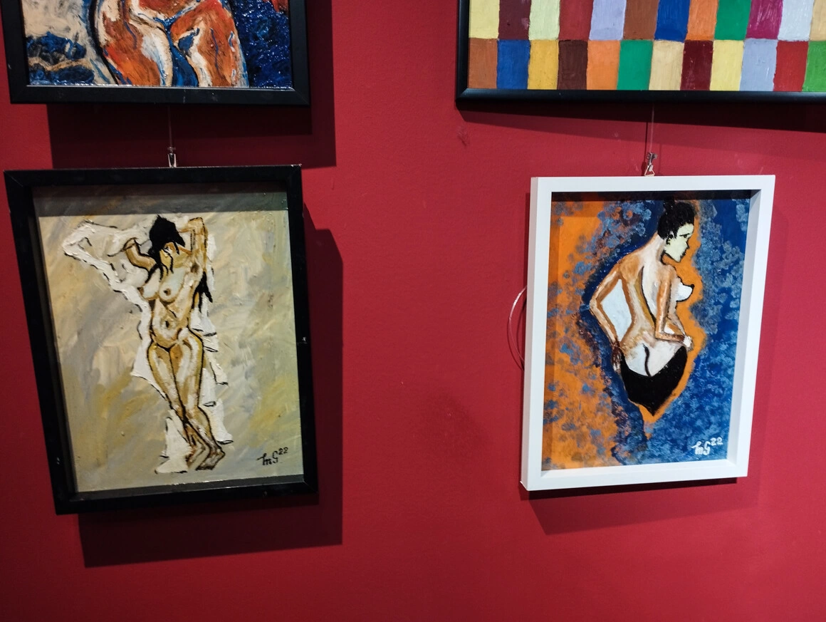 Până să înceapă vernisajul, dau și eu o tură de expoziție, printre cele 68 de lucrări - tot câte una pentru fiecare an din viață. Sunt multe nuduri de femei contorsionate în toate pozițiile și pisici. Culori stridente, coapse, sâni + pisici. Lascivitate și felinitate. O cromatică apăsătoare, un „erotism” cu iz de anii ‘90 și care mă trimite cu gândul la bomboane fondante și la alte tablouri pe care le-am văzut în camerele unor pensiuni obscure din Buzău, Onești sau Herculane.