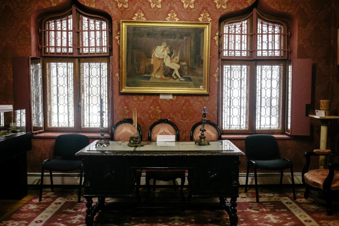 În spațiul de lucru al savantului nu poți să nu remarci o gaură perfect rotundă în perete. Biroul din lemn masiv e făcut din unul dintre nucii seculari care se aflau odinioară în curtea castelului. Încăperea e dominată de trei ample portrete: Hasdeu, Iulia-fiica și Iulia-mama.