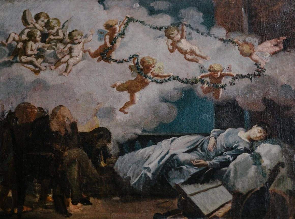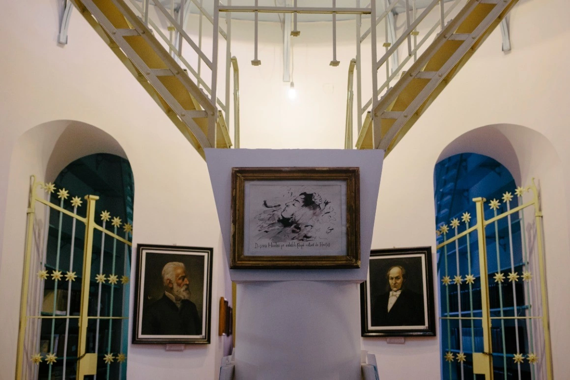 În camerele de lângă, cu vitralii colorate, stătea odinioară biblioteca lui Hasdeu. Acum, pereții sunt acoperiți de picturi și fotografii de epocă, dintre care una mi se întipărește în memorie - Hasdeu pe patul de moarte, cu doar șase zile înainte să se ducă. Pe columna care se extinde spre cupolă stau laolaltă acuarele și desene ale elevilor din Câmpina, despre copilărie, familie, prietenie; cât și un crochiu al artistului Sava Henția, care o înfățișează pe adolescenta Iulia Hasdeu pe catafalc.