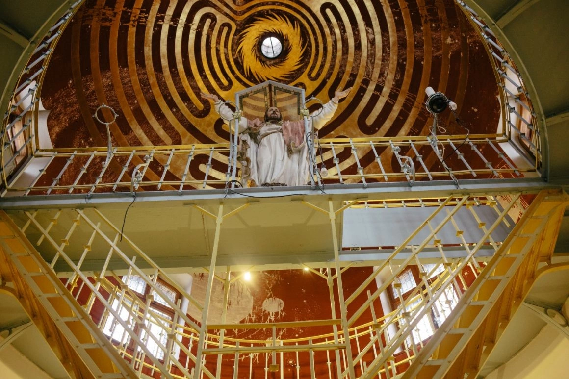 În încăperea bordată cu marmură trandafirie, două scări de metal vopsite în galben, culoarea eternității în simbolismul creștin, suie spre puntea cupolei, unde se află altarul. Caragiale scria în epocă: „Divinul Fiu se înalță cu fața către isvorul luminii, către Răsărit. Din vârful domului azuriu, Ochiul lui Dumnezeu înconjurat de stelele infinitului, îl privește așteptându-l cu dragoste.” Hasdeu i-ar fi spus atunci lui Caragiale că axul încăperii și cupola alcătuiesc un pocal, asemenea Sfântului Graal.
