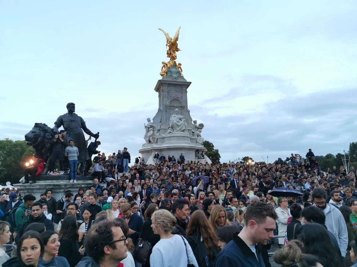 E trecut de șapte de-acum. Un camion verde se mișcă încet prin mulțime, ca să monteze în continuare limitatoare de trafic, bănuiesc. Bărbatul de la volan pare epuizat. Sunt mai mulți oameni în fața Palatului Buckingham și primele flori au fost împinse printre porțile sale. Eu și prietenul meu ne hotărâm să plecăm și să ne întoarcem mai târziu. Ratăm celebrul curcubeu dublu, pe care îl voi vedea mai târziu afișat pe rețelele de socializare ca prim pas înspre canonizarea Reginei. Dar acum se îndreaptă mai mulți oameni spre noi, cu buchete în mână și toți cu expresii hotărâte pe chip. E cel mai apropiat lucru de îndurerarea fățișă pe care-l văd azi.