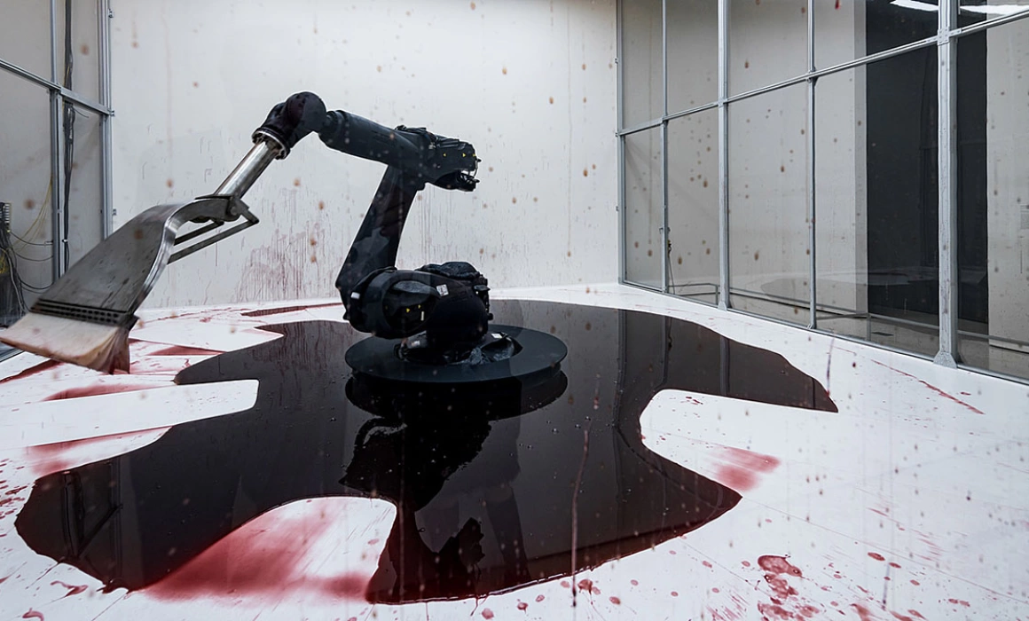 Imaginea principală: Detaliu al lucrării „Can't Help Myself”, creată de artiștii Sun Yuan și Peng Yu, la îndemnul curatoarei Xiaoyu Weng. Sursa: Guggenheim Museum