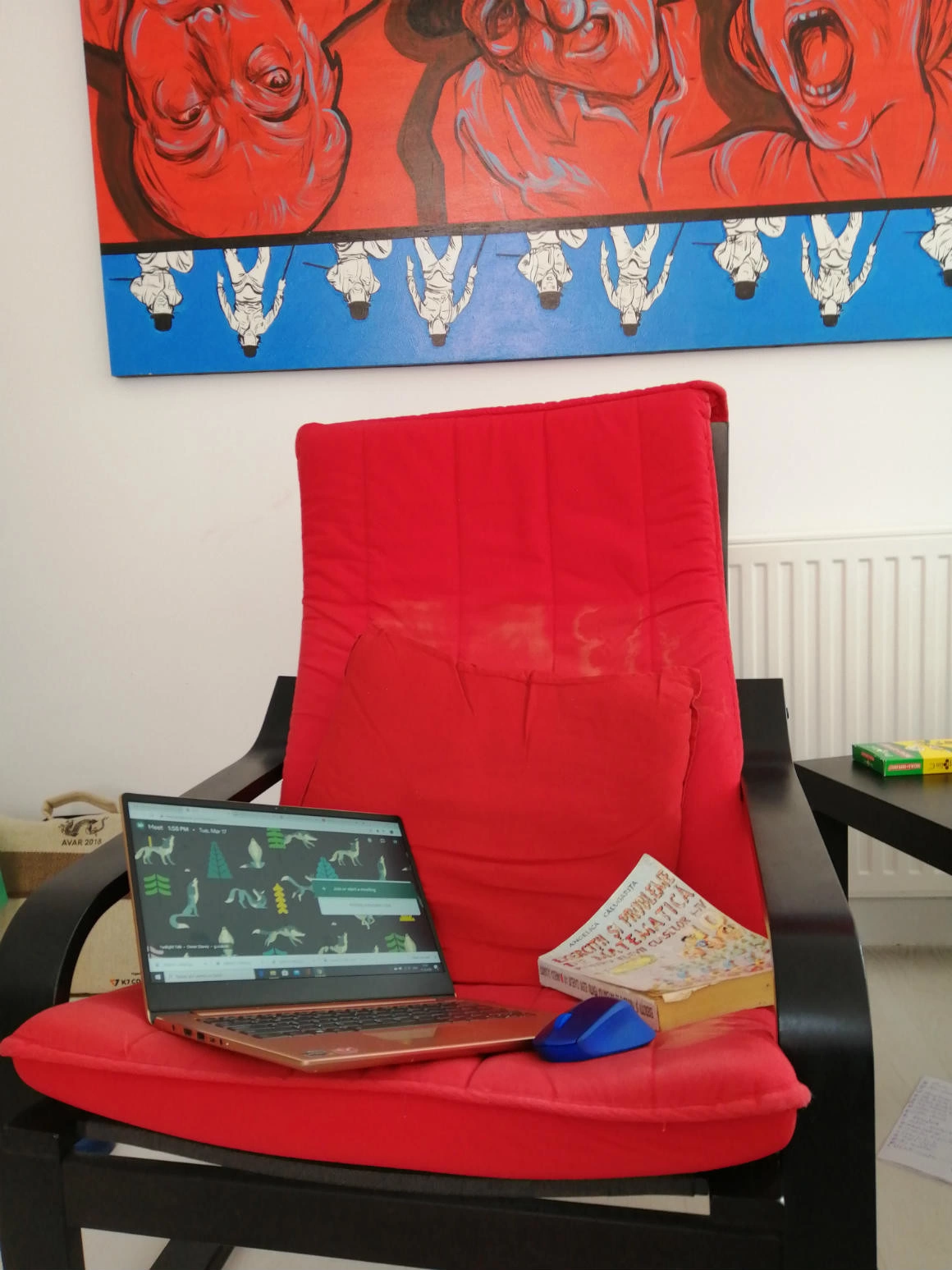 Lucratul de acasă, în contextul ultimelor două săptămâni, este cu totul altceva. Mi-am schimbat aproape toate rutinele, sar de la un lucru la altul și sunt mai puțin concentrată. Sigur, e o stare de anxietate generală, din ce citesc în articolele psihologilor și pe rețelele sociale, deci e mai puțin vorba de faptul că lucrăm de acasă, cât faptul că am fost luați pe nepusă masă, fără să avem timp să planificăm sau să ne obișnuim, la care se adaugă și alte temeri (de îmbolnăvire, sau „ce va fi cu job-ul meu”, etc). Nu găsim locul potrivit în care să lucrăm – eu am lucrat două zile din pat, iar în nopțile respective am dormit mai agitat și mai puțin. Mi-am făcut apoi loc ca găina la biroul meu mic, pe care stăteau strânse tot felul de lucruri și la care am stat doar de câteva ori de când l-am cumpărat (sunt cam patru ani de atunci). Mă bucur că scutesc timp cu drumul între pat și birou, însă pe termen lung am nevoie de soluții ca să înlocuiesc nevoia de a mă detașa de lucru, mai mult decât mersul în baie și bucătărie, unde fac excursii organizate de câteva ori pe zi. De regulă, prefer mai mult să scriu decât să vorbesc, și la birou îl bodogăneam uneori pe colegul meu care mă întrerupea ca să mă întrebe ceva sau să facă o glumă. Ei, uite că acum mi-e dor de glumele lui și sunt sătulă puțin de scris mailuri și mesaje.