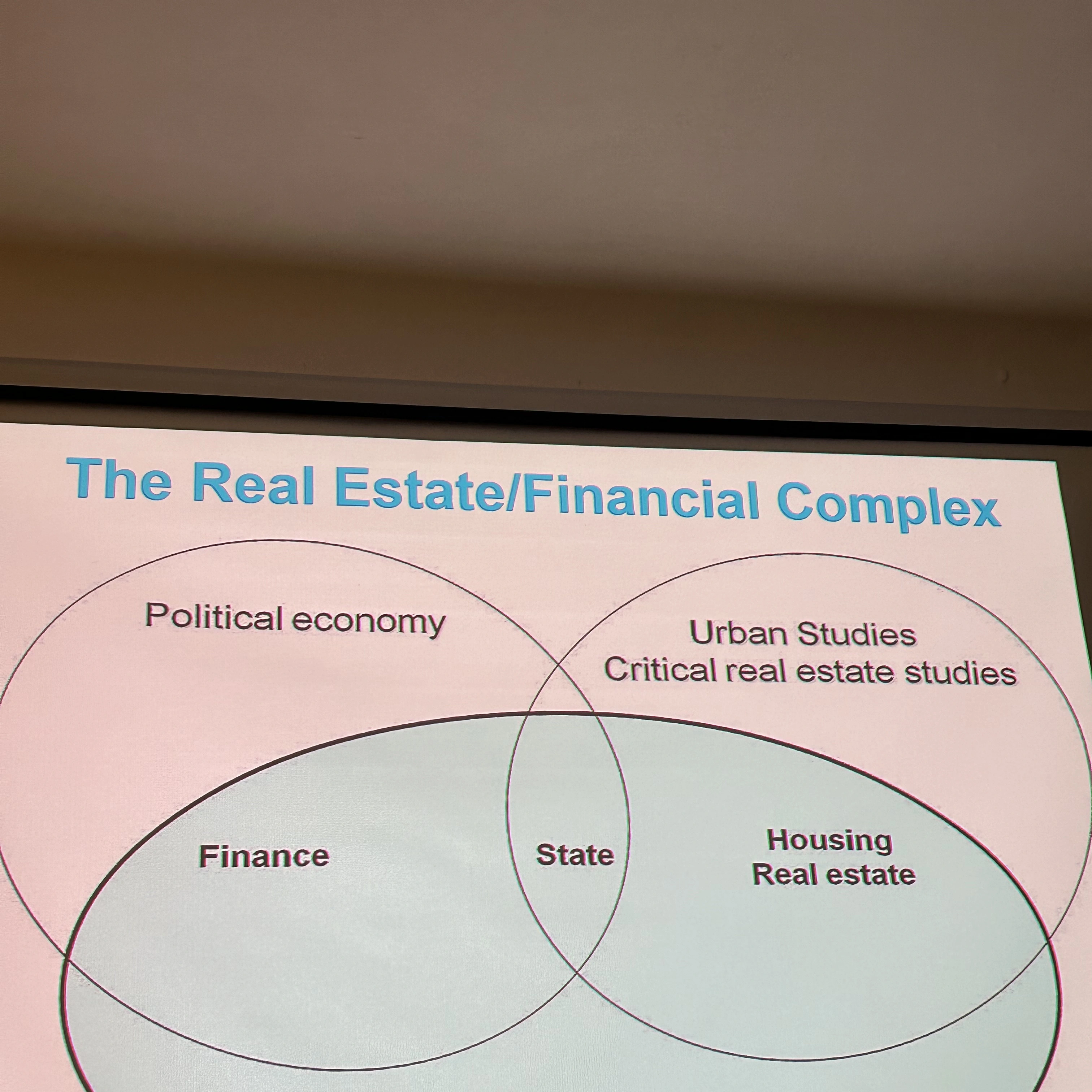 În aceeași zi a urmat prezentarea aceluiași Manuel Aalbers The Real Estate/Financial Complex, care a arătat cât de strâns e legată dezvoltarea imobiliară de domeniul financiar și cum, la rândul lor, actorii financiari influențează și dau direcțiile dezvoltării imobiliare ca proces global. Aalbers a pornit de la premisa că în ultimele decenii tot ce înseamnă producție a început să aibă profituri mai mici și să valoreze mai puțin din produsul intern brut al țărilor membre în Organizația pentru Cooperare și Dezvoltare Economică (OECD), în timp ce activitățile speculative financiare capătă un rol mai mare.