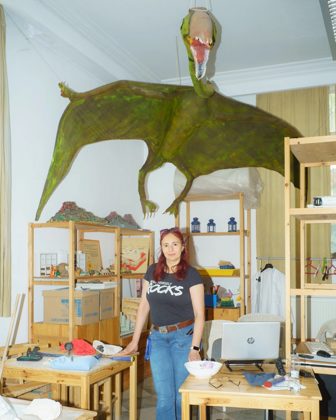 Când le-am cunoscut pe Marilena Constantin și Rodica Prică, cele două lipeau și pictau țepii de pe spinarea reconstrucției unui Struthiosaurus transilvanicus, un dinozaur ierbivor, cu corpul acoperit de țepi pentru protecție, care în realitate avea până la 3 metri lungime și 450 de kilograme, descoperit prima dată în România. Reconstrucția e în inventarul muzeului de 15 ani și recent a fost avariată, niște țepi fiindu-i rupți. Nici Marilena, nici Rodica nu sunt restauratoare și nu au experiență formală în zona artelor.