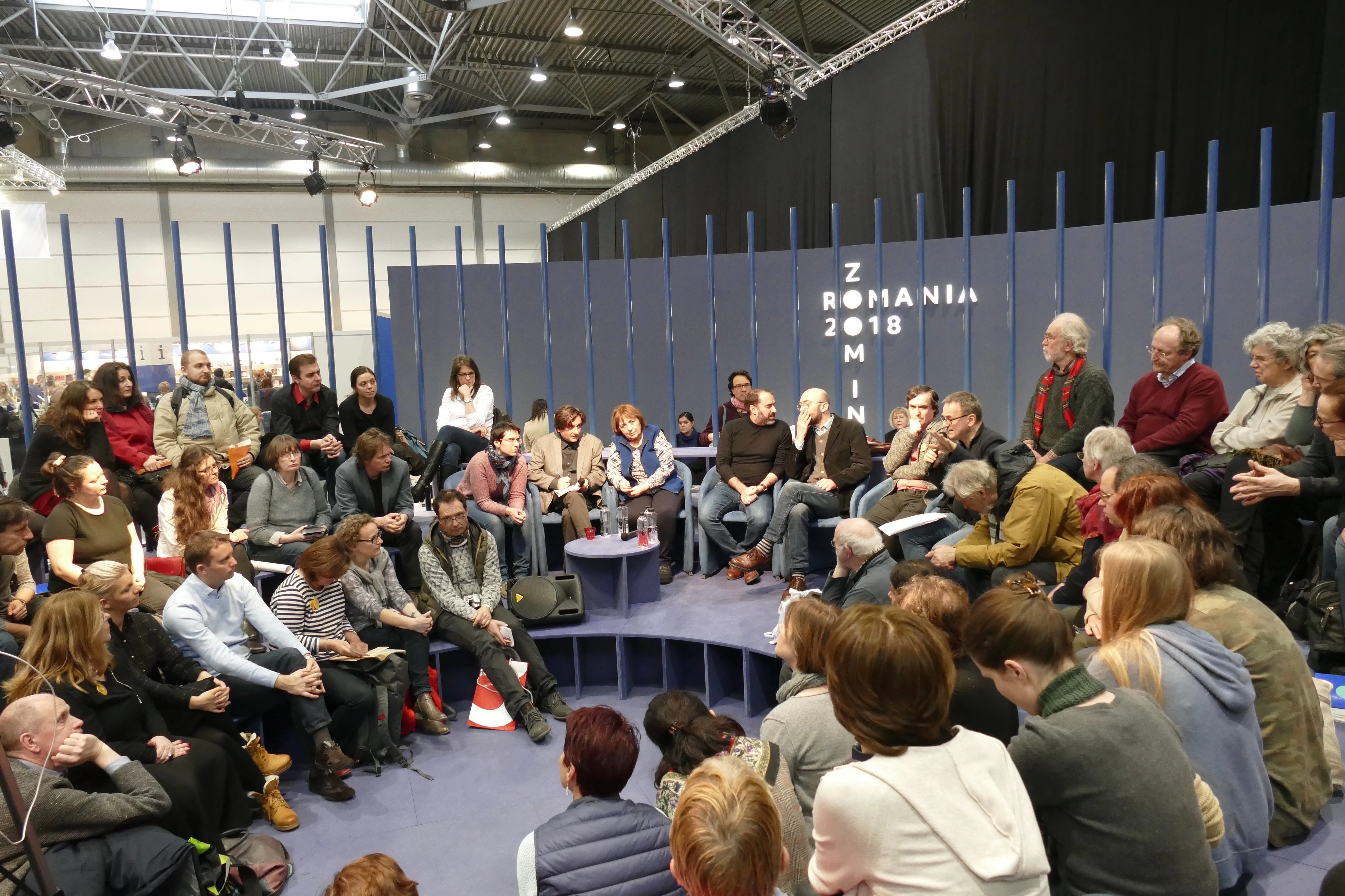 Mă îndrept spre scenă, la o discuție despre două antologii de proză scurtă românească, traduse recent în germană, cu texte scrise de unii dintre cei mai buni autori români: Gabriela Adameșteanu, Petru Cimpoeșu, Bogdan Costin, Adela Greceanu, Marin Mălaicu-Hondrari, Nora Iuga, Dan Lungu, Florin Iaru, Ana Maria Sandu etc. Toate locurile din public sunt deja ocupate de vizitatori germani, de oameni din delegația venită de la ministerul din București și români care locuiesc în Germania. „Mulțumim că sunteți cu noi în această minunată cușcă”, glumește editorul german către invitații Gabriela Adameșteanu, Lavinia Braniște, Bogdan-Alexandru Stănescu (care tocmai a câștigat premiul pentru proză la Gala Premiilor Radio România Cultural, pentru „Copilăria lui Kaspar Hauser”) și ceilalți doi editori germani. Stănescu, coordonatorul unuia dintre volume și al colecției de literatură universală de la Biblioteca Polirom, spune că se bucură de apariția antologiilor, pentru că „proza românească este vie, inteligentă, puternică și amuzantă”. Gabriela Adameșteanu pune în discuție o temă căreia i s-a dedicat mult spațiu de dezbatere pe parcursul târgului - cum descoperim și creștem traducători de română în germană - și spune că aceste cărți mai au și meritul de a aduce în prim-plan traducătorii tineri.