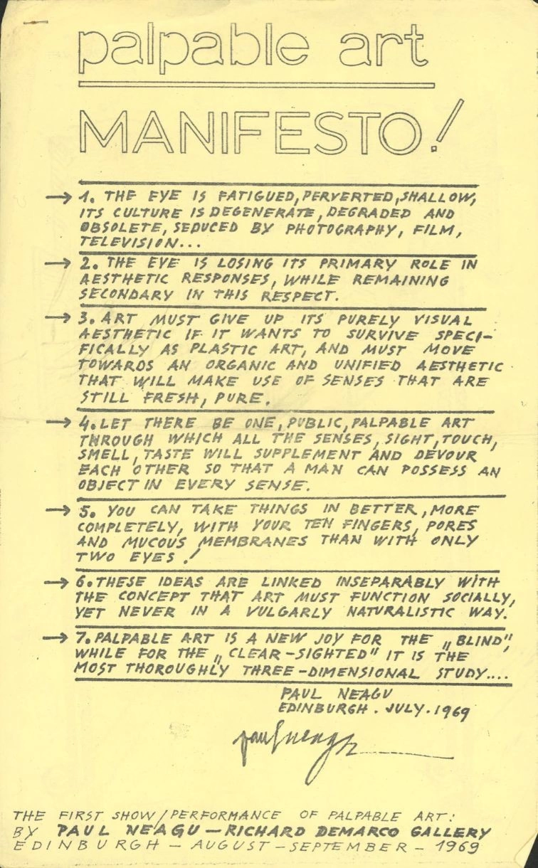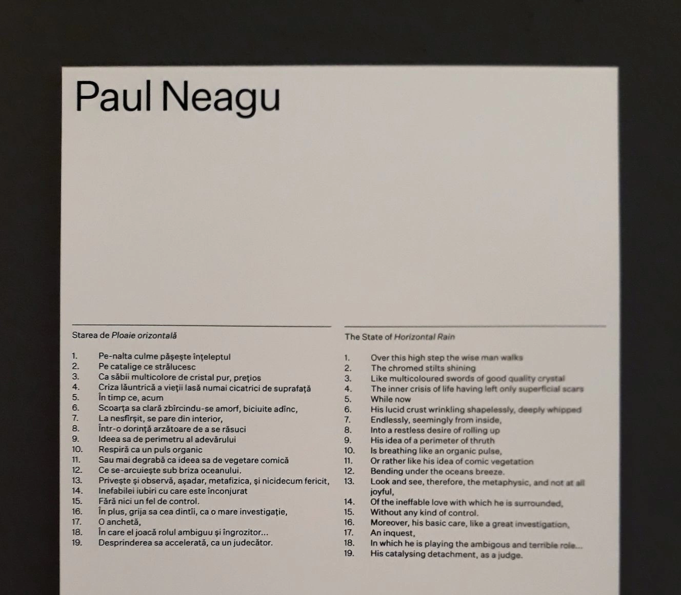 Preocupări similare cu Horia Bernea are și Paul Neagu, doar că le exprimă în limbaj literar, prin poezie-manifest. Textul respectiv declanșează plăcerea cititorului de literatură, dar și pe cea a vizitatorului de expoziție. Mai încolo, „înțeleptul pe catalige” devine un video ușor stângaci cu un performance în care Neagu încearcă să traverseze o pajiște verde din jurul unei biserici, într-o filmare făcută în Anglia. Ce e frapant în text e că observatorul e înconjurat de o „inefabilă iubire” pe care o privește și o observă ca pe o metafizică, nefiind „deloc fericit”. E de subliniat aici că, atât interogațiile lui Bernea asupra rostului și aspectului picturii, marcat de interesul pentru „problemele spirituale ale timpului”, cât și explorarea făcută de Neagu asupra a ceea ce el numește Antropocosmos, vor avea un puternic ecou în anii 1980 asupra scenei locale de artă, suferind și o puternică transformare.