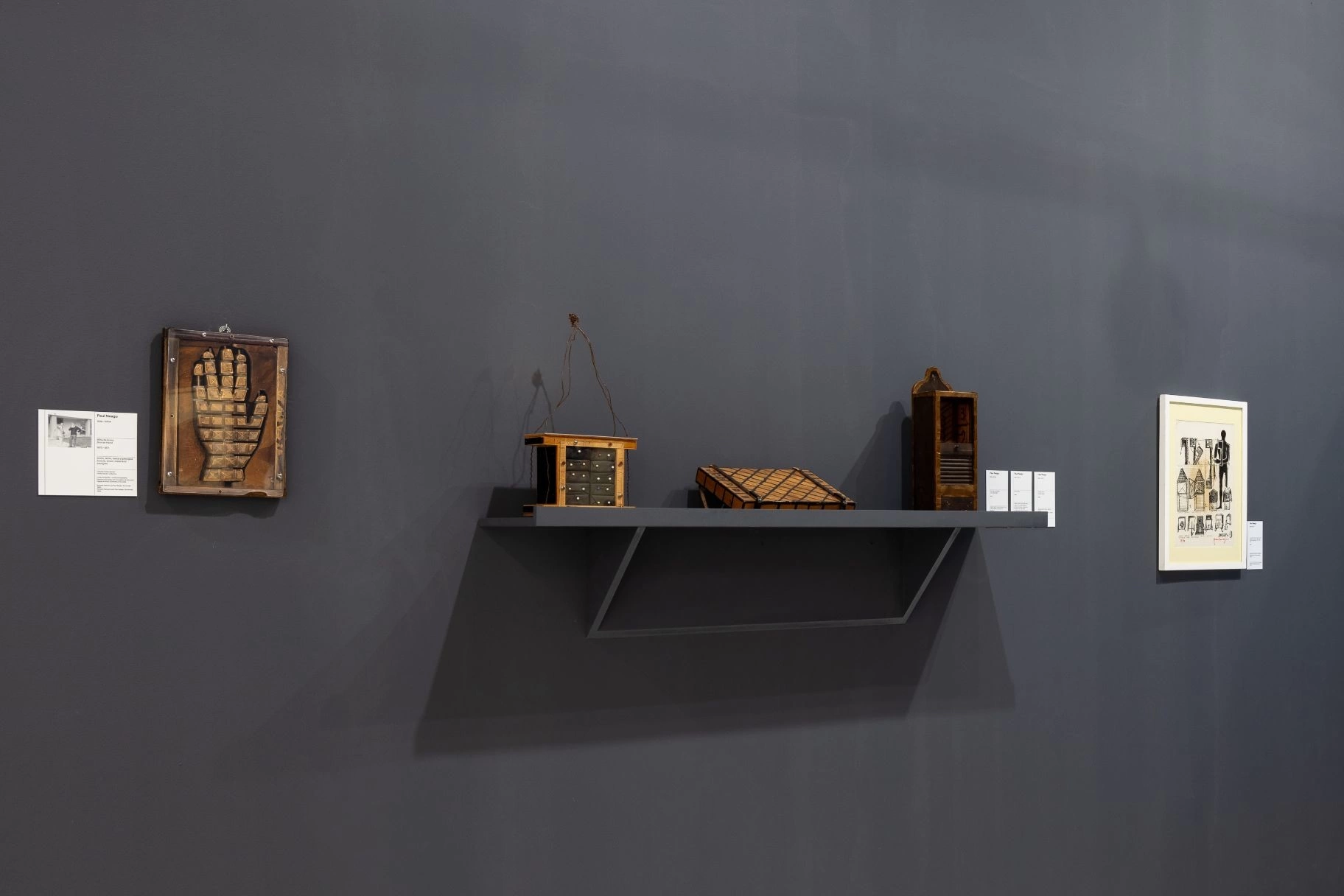 Sub panourile de cronologie montate pe perete se află o serie de vitrine-casetă, în care se găsesc afișe, pliante și alte mici publicații, dar și fotografii și documente care susțin întreaga demonstrație istorică a expoziției.