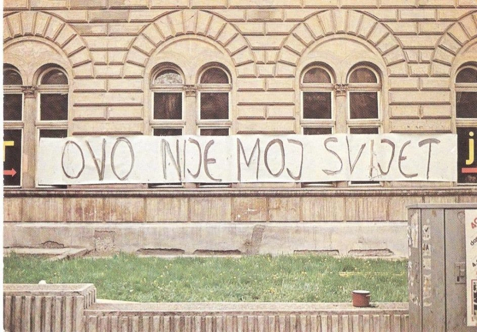 Frapant e însă mesajul pe care alege să îl transmită în timpul spectacolului, probabil un text relevant pentru piesa de teatru. Apropo de eradicarea oricărui conținut politic al acestei „delegații de artiști români” trimiși să reprezinte țara în străinătate, mi-a venit în minte ca punct de comparație o lucrare a unui artist croat din aceeași epocă. Este vorba de Željko Jerman, care în 1976 atârna pe o clădire din Belgrad un banner de mari dimensiuni pe care scrie „Aceasta nu e lumea mea”.