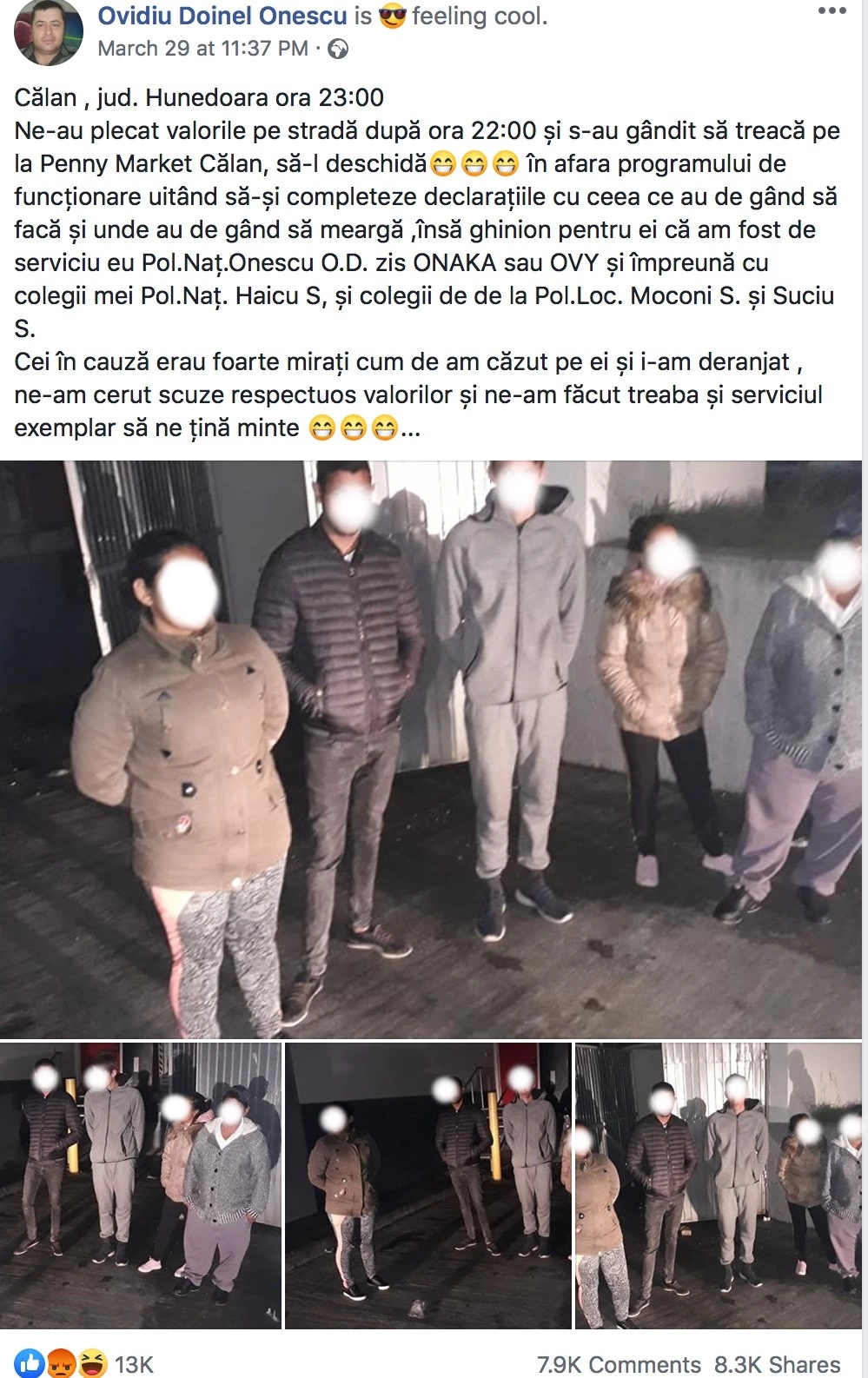 După ce le-a deschis dosar penal pentru furt și i-a amendat în baza ordonanței militare, că nu aveau voie să fie pe stradă la acea oră, polițistul i-a dus înapoi în spatele supermarketului. Acolo le-a spus că le face poze pentru reconstituirea momentului, pe care le va posta pe internet, „«să vă fac vedeta orașului și a globului»”, îmi spune Mirela. Deși oamenii l-au rugat să nu îi umilească public, pozele au ajuns la scurt timp pe profilul de Facebook al ofițerului Ovidiu Doinel Onescu, fără ca fețele oamenilor să fie blurate.