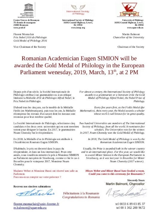 Recapitulare: Florent Montaclair (49 de ani) i-a trimis la finalul lui 2018 o scrisoare academicianului Eugen Simion, prin care îl anunța că ar fi câștigat „Medalia de Aur pentru Filologie”. Premiul i-ar fi fost acordat de către Societatea Internațională de Filologie, care în trecut l-ar fi medaliat și pe Noam Chomsky. Totodată, francezul reușise să convingă doi europarlamentari români să organizeze în martie la Parlamentul European o ceremonie de premiere pentru Simion.