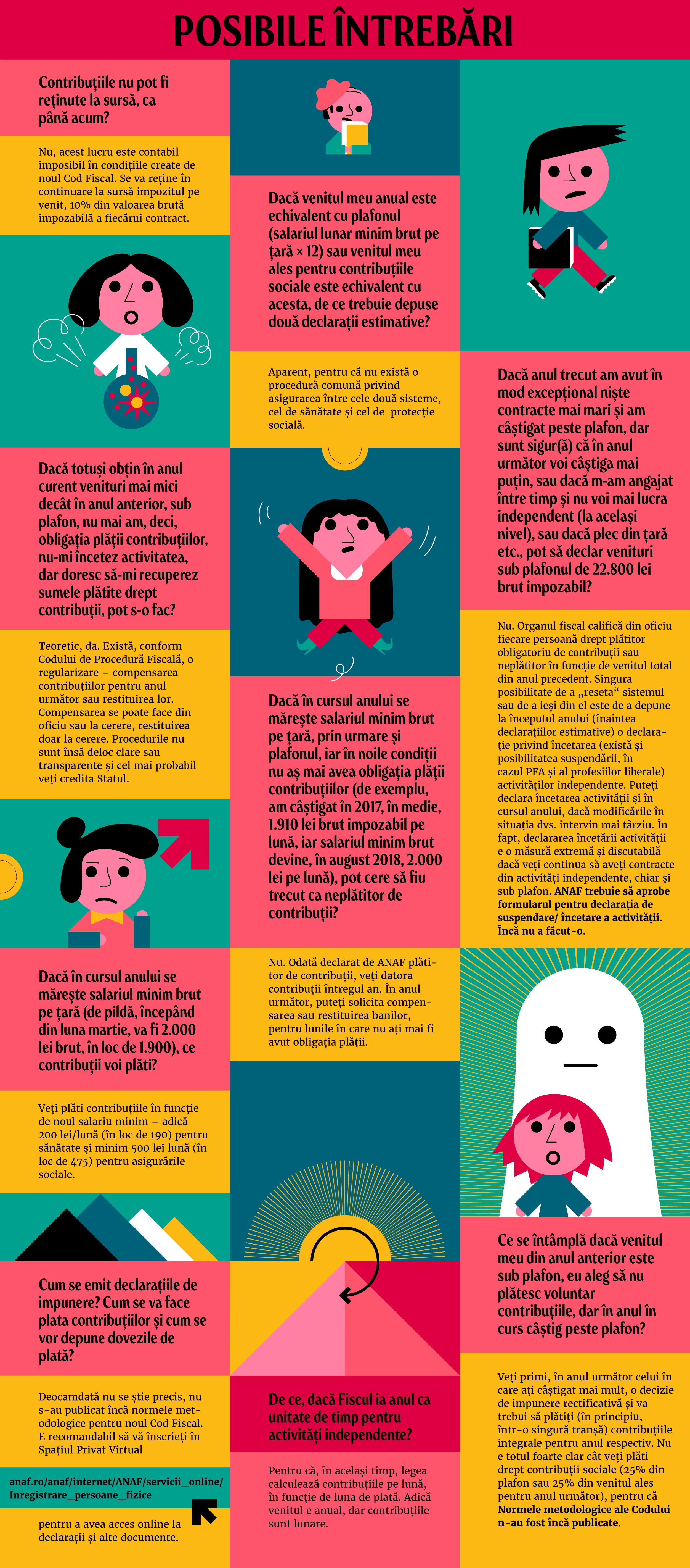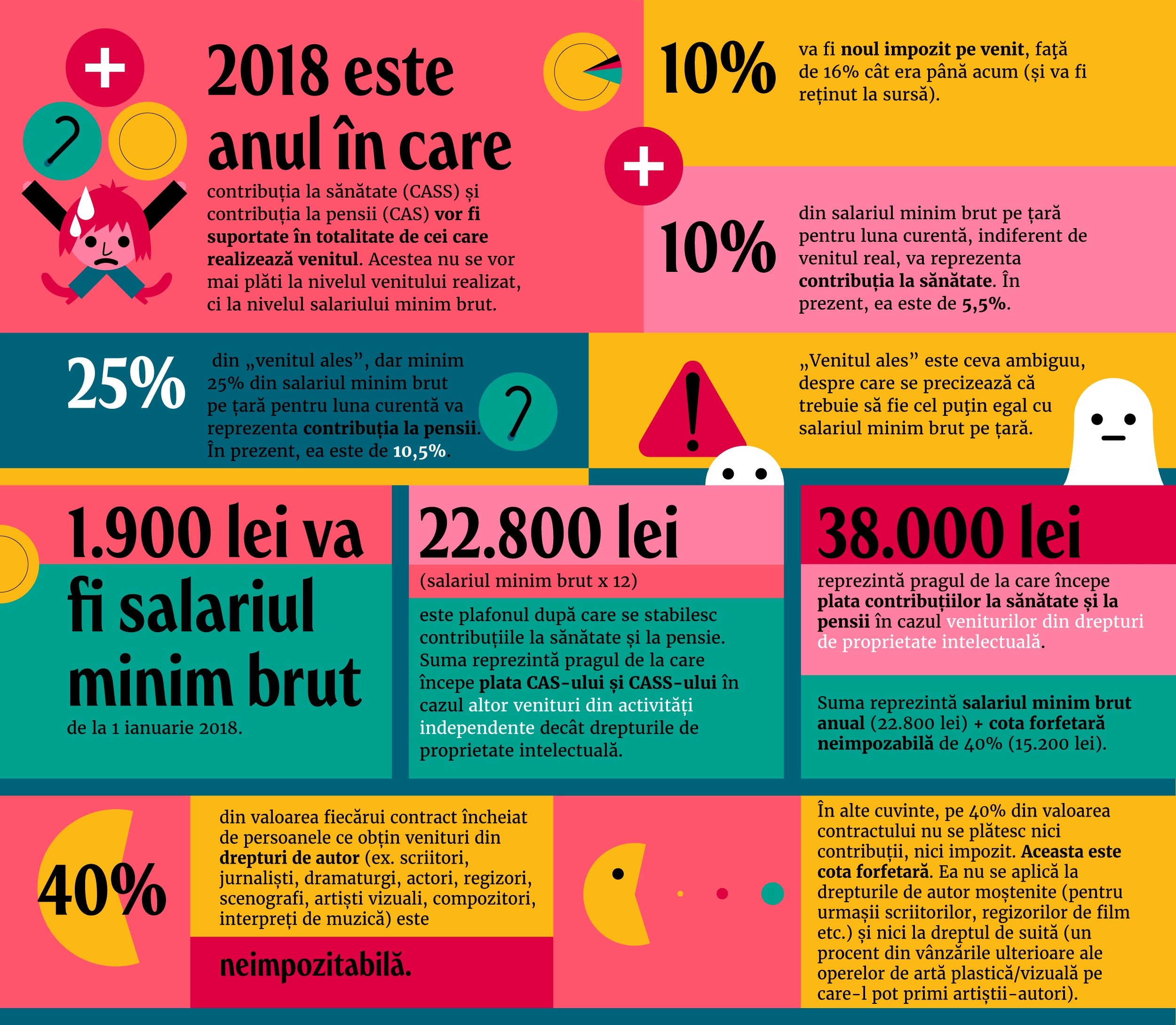 Costul muncii independente va creşte cu 20-25% în mod real, nu contabil, susțin organizatorii dezbaterii „Statul, banii și liber profesioniștii”, găzduită aseară de spațiul MACAZ - Bar Teatru Coop.. Asta pentru că, în cazul lucrătorilor independenți, nu e vorba despre niciun transfer al contribuţiilor de la angajator la angajat, cum este în cazul salariaților, ci de o pură majorare. Jurnalista Iulia Popovici, cunoscută pentru expertize și diagnoze culturale (inclusiv privind regimul fiscal al lucrătorilor culturali), a tras aici un prim semnal de alarmă în această privință, după adoptarea OUG 79/2017 pentru modificarea Codului Fiscal. Apoi a făcut calcule și-a pus date cap la cap, să vadă ce-ar urma să înfrunte, din 2018, lucrătorii independenți (care nu realizează activități agricole), printre care se numără jurnaliștii, traducătorii, actorii, regizorii sau scenografii. A adunat ce-a aflat în infograficul de mai jos, făcut de Sorina Vazelina, și a detaliat informațiile în dezbaterea de la MACAZ, alături de consultantele fiscale Ana-Maria Grecu şi Raluca Nicolae și de regizorul independent David Schwartz.