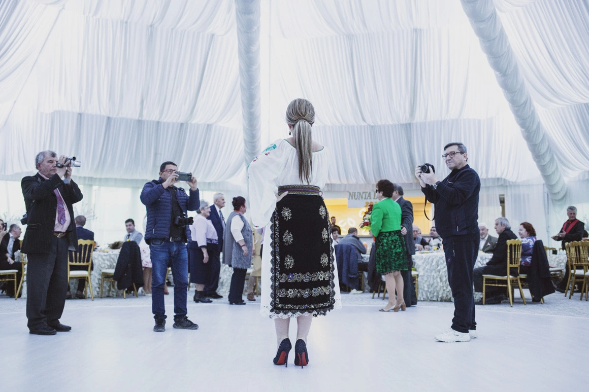 Între platourile cu gustări și farfuriile cu sarmale, pe ringul de dans se începe, timid, o horă. O cântăreață tânără de muzică populară, în jurul căreia se strâng câțiva domni cu telefoane și camere de filmat, pune pe ritm alert fantezii cu dragoste și verdeață: