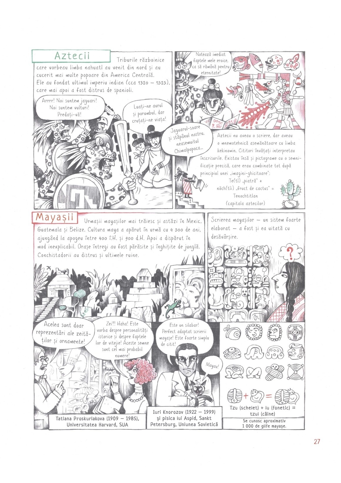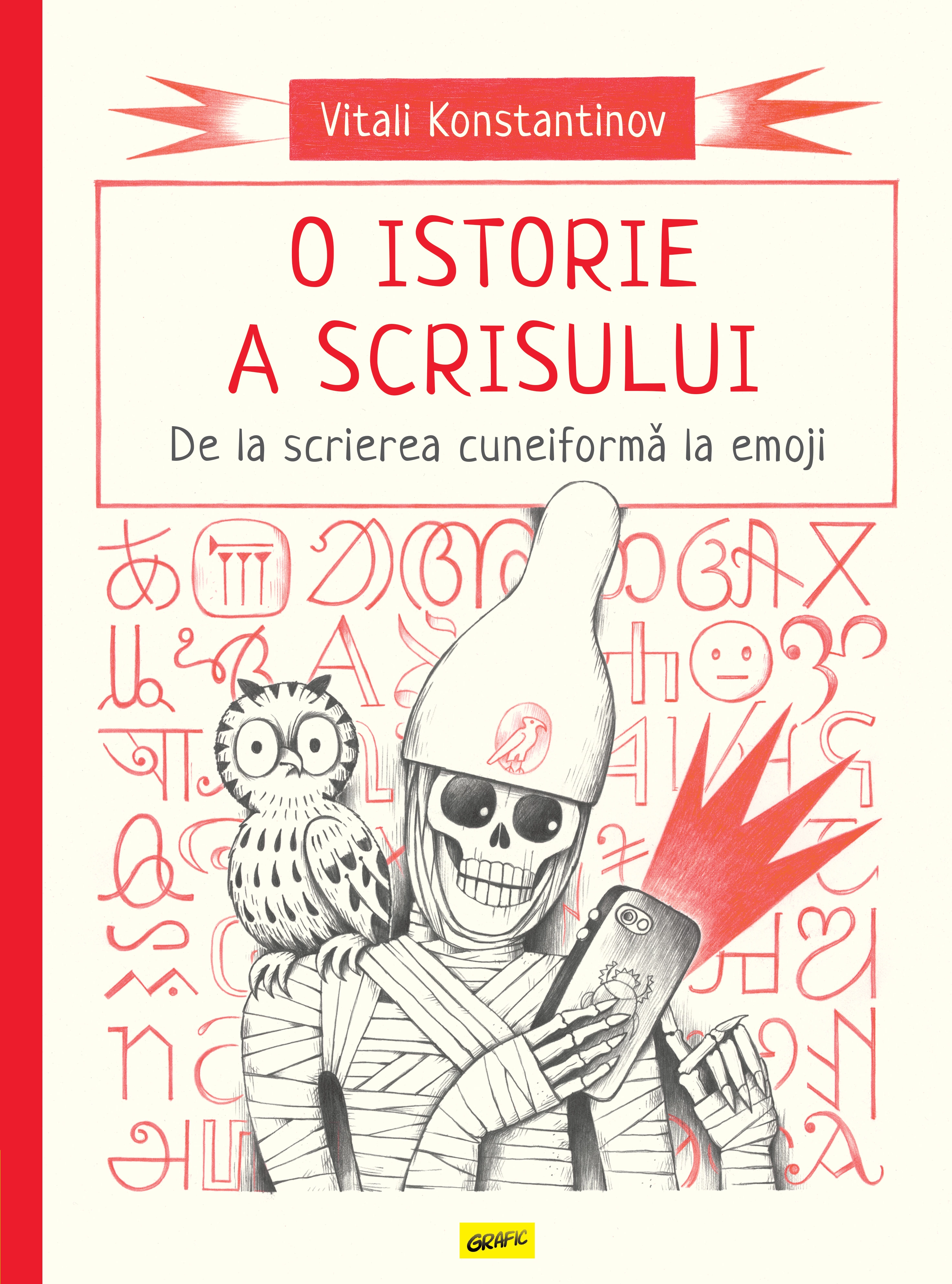 Astfel de informații afli din cartea O istorie a scrisului. De la scrierea cuneiformă la emoji, scrisă și desenată de Vitali Konstantinov, apărută în 2023 în colecția Grafic la Editura Grafic, tradusă din limba germană de Bianca Șahighian.