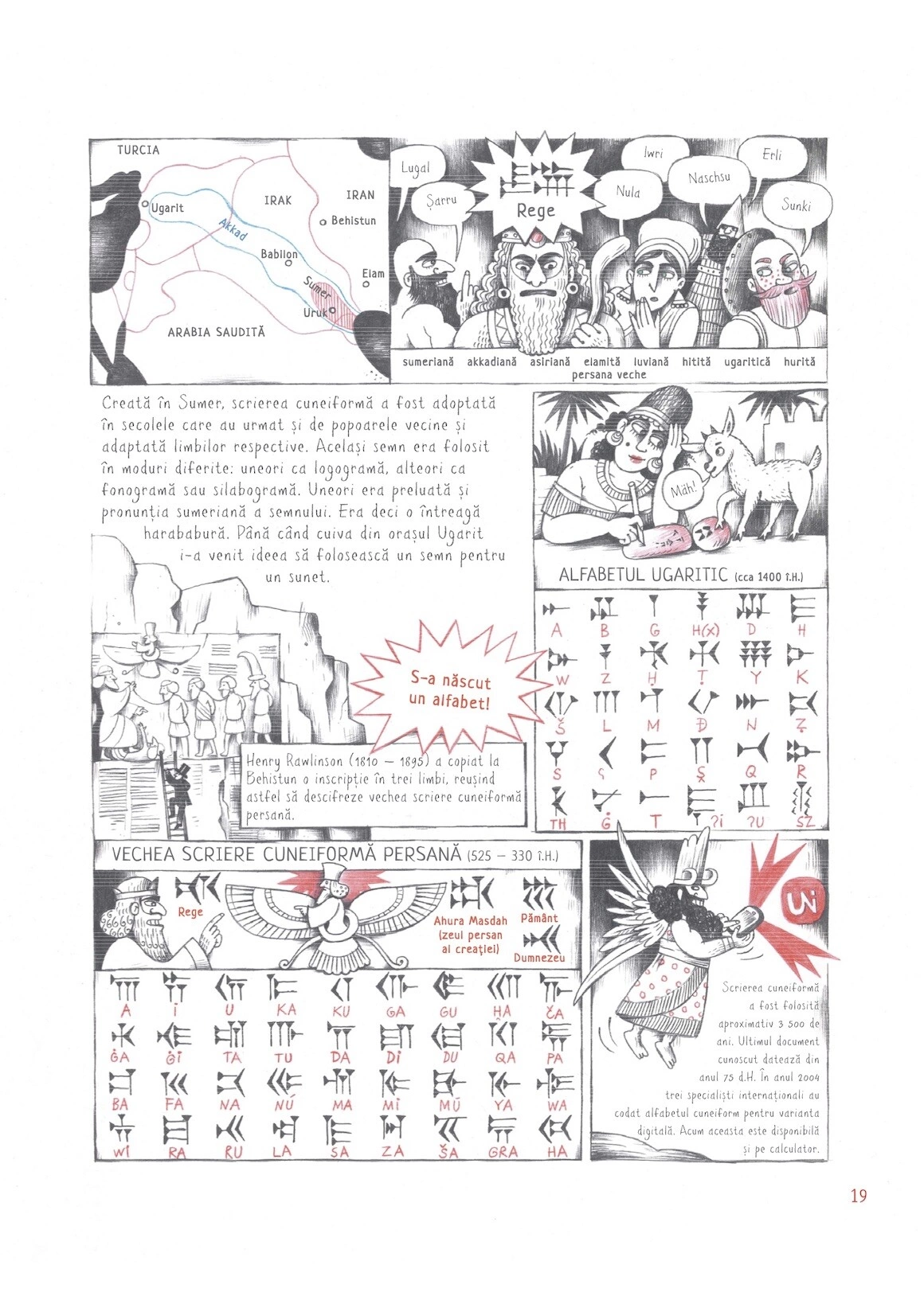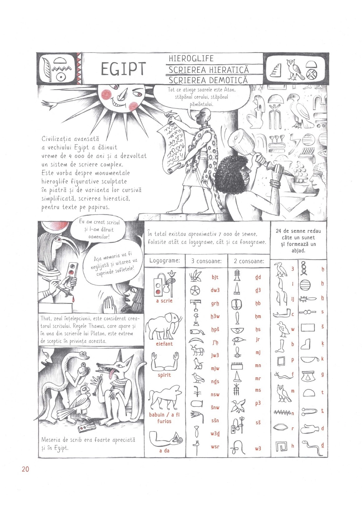 Cu umor și curiozitate, povestea te poartă prin istoria scrierii (și deci într-un fel a umanității) din Mesopotamia până în Japonia, de la mari civilizații, la triburi și populații puțin cunoscute.