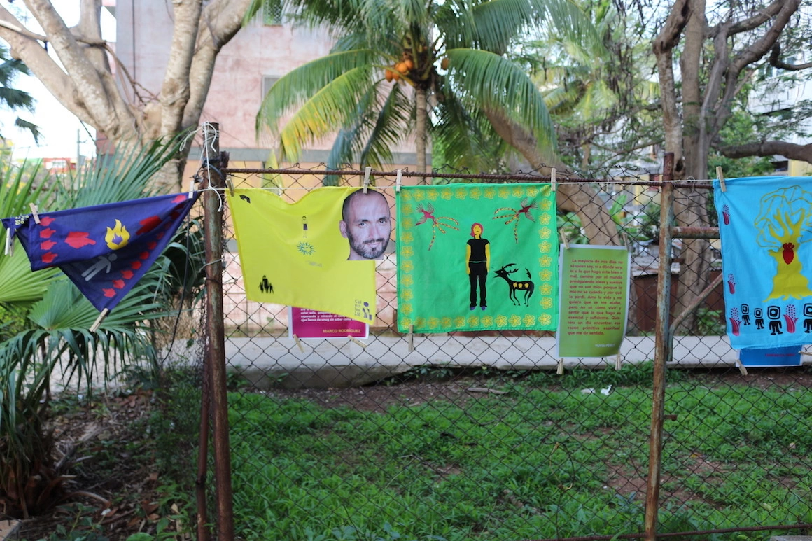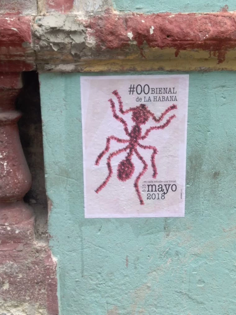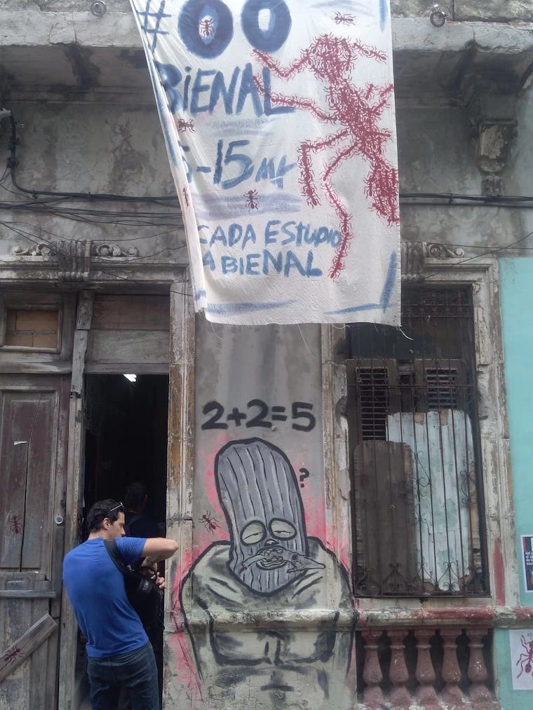 Clădirea pe care tocmai se monta bannerul bienalei avea acoperișul prăbușit. Câțiva oameni se agitau să pună la punct ultimele detalii. Un grup de artiste europene ieșeau în evidență cu bocancii și hainele lor negre. Purtam o geacă de un galben intens ce mă transforma într-un canar și mă plasa din punct de vedere cromatic mai aproape de localnici însă nimeni nu părea să mă bage în seamă. Apoi a apărut Yania și dintr-o dată lumea greu de înțeles în care mă aflam de trei zile a început să capete sens. M-a dus într-un local ieftin din apropiere și am înfulecat prima dintre cele zeci de pizze pe care aveam să le mănânc în restul lunii. Ne-am întors la timp pentru a prinde discursul de deschidere ținut în stradă de către cei cinci organizatori principali: Luis Manuel, artist vizual, motorul și imaginea bienalei, Yanelys, partenera sa, istoric de artă, Amaury Pacheco Omnipoeta, poet și artist vizual, Iris, soția lui, dramaturg, Soandry del Rio, rapper. Nu realizam foarte bine, dar asistam la un eveniment istoric: prima bienală independentă dintr-o țară comunistă în anul 2018.