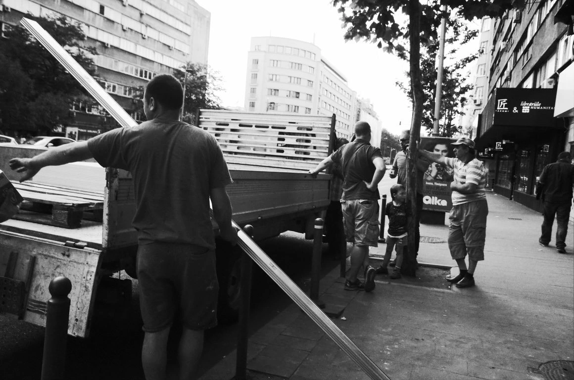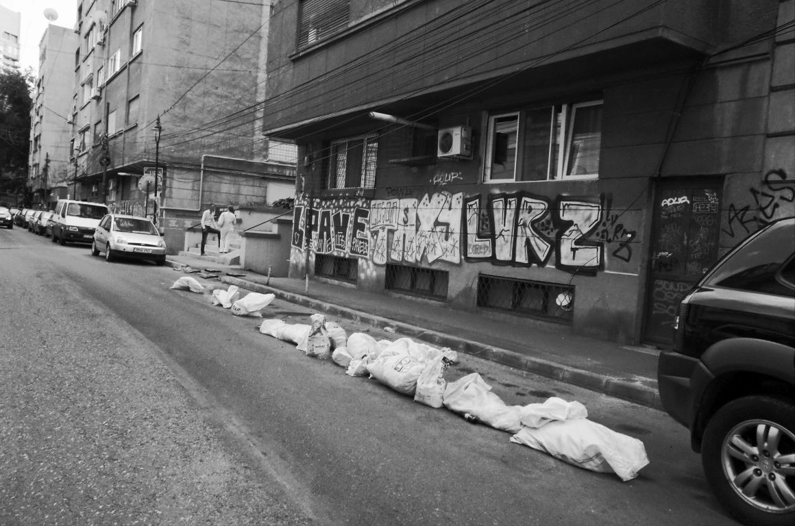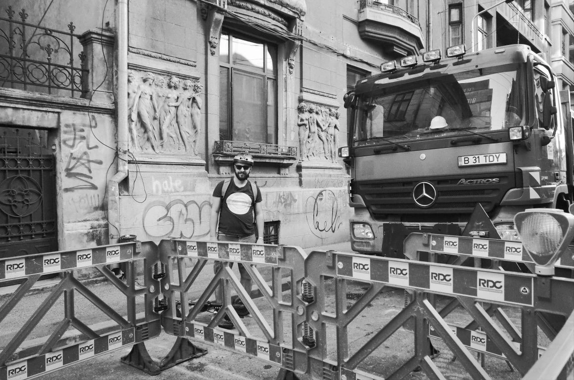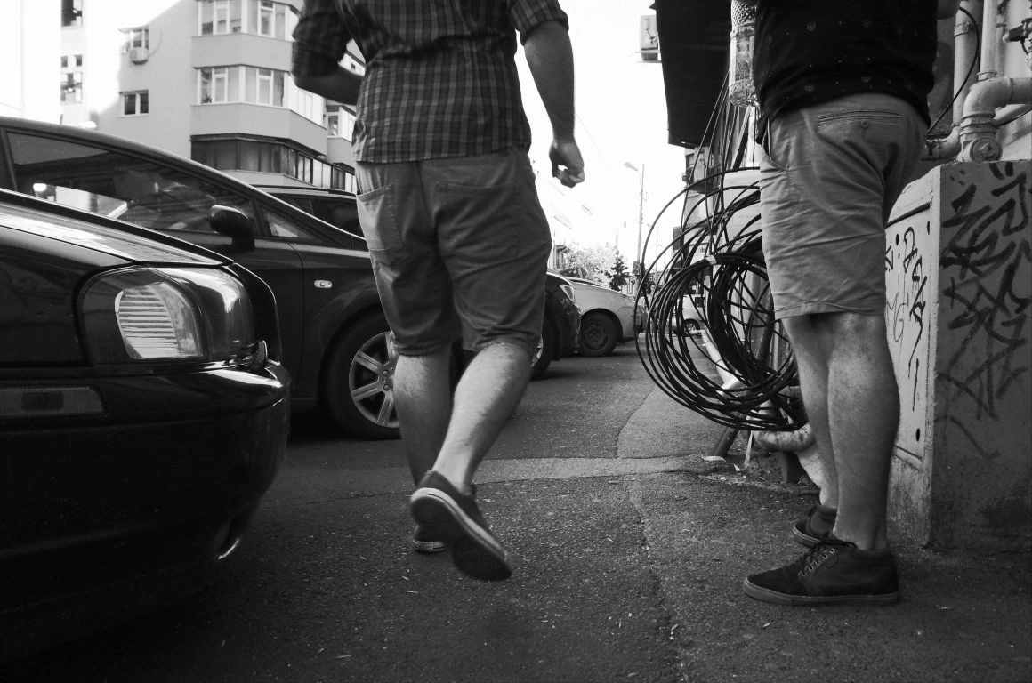 Clădiri bizare răsar ca buruienile atunci când nu cultivi nimic, boturile mașinilor, panouri electrice, saci de ciment, grămezi de gunoaie, țevi de gaze ne împung pe trotuarele strâmte, unde ne ferim unii de alții și ne dăm la o parte ca să ne facem loc. „De când sunt mic, n-am mers niciodată pe trotuarul ăla”, spune un băiat la 30+, arătând spre o porțiune de pe Sfinţilor, unde maşinile aproape că sunt lipite de perete.