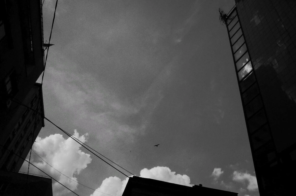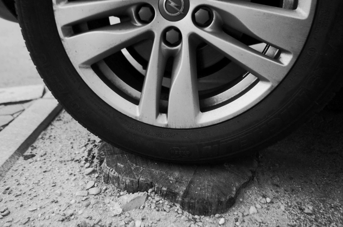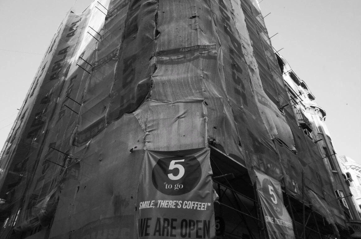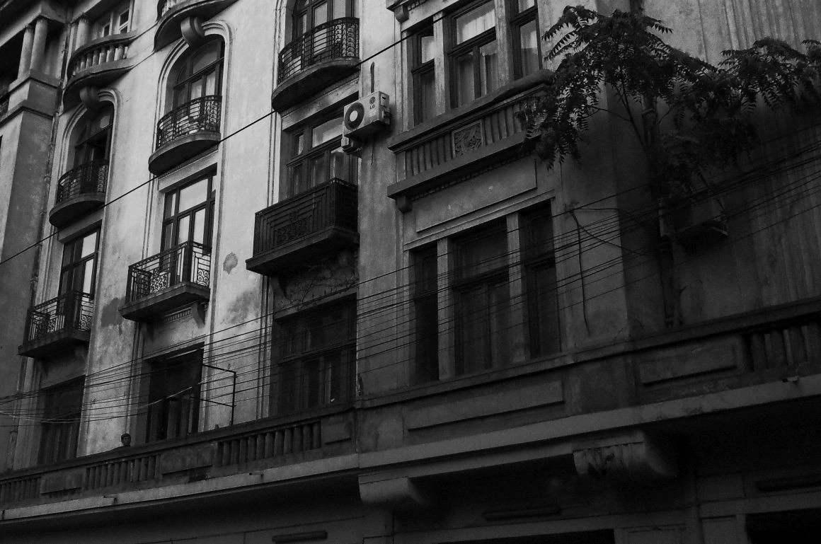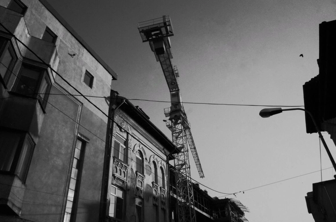 Clădiri bizare răsar ca buruienile atunci când nu cultivi nimic, boturile mașinilor, panouri electrice, saci de ciment, grămezi de gunoaie, țevi de gaze ne împung pe trotuarele strâmte, unde ne ferim unii de alții și ne dăm la o parte ca să ne facem loc. „De când sunt mic, n-am mers niciodată pe trotuarul ăla”, spune un băiat la 30+, arătând spre o porțiune de pe Sfinţilor, unde maşinile aproape că sunt lipite de perete.