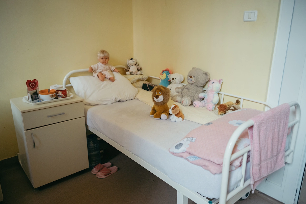 În salonul din dreapta, o bătrână citește o felicitare pe marginea patului. În fața ei stă I., o femeie de 35 de ani cu o formă de dizabilitate mintală care a blocat-o într-un corp de fetiță. Patul ei e cel mai colorat. O coloană de animale din pluș o protejează de coșmaruri noaptea. În prietenia lor, I. a găsit o mamă pe care n-a avut-o, iar bătrâna a redevenit bunică. Aici, colegii de cameră se potrivesc în funcție de diagnostic, dar și de nevoile emoționale. „Dacă avem un pacient cu manie, îl punem lângă un pacient cu depresie. Se temperează unul pe altul”, spune medicul Muțiu, care e și șefa acestei secții.