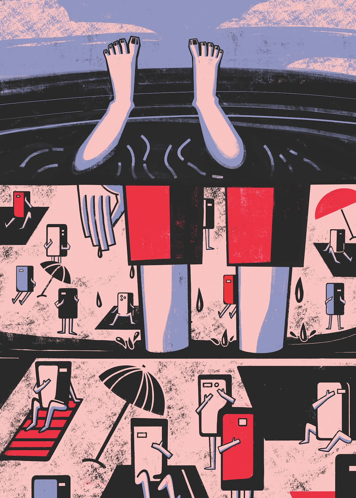 Ai fost singur în apă, acest proto-ocean de informație moleculară, vie și plină de vietăți; ceilalți stau unde i-ai lăsat, umflați pe nisip de zăduful adânc al unei zile cu nori aproape uniți de pământ. Sunt tot acolo, în corpul comun al rețelei, conectați la sursele (artificiale) ale unei trăiri din ce în ce mai binare (da/nu, stânga/dreapta, love/hate). Înghițind notificări în culori, tastând cuvinte alese până la urmă de procesor, apăsând fiecare inci al ecranului arzător, comandând și blocând, excitând și urând, urlând cu LITERE MARI și plângând fără cuvinte mari, prin emojiticon, toți se fac că au ceva de făcut în singurul lor timp doar al lor. Pixel și control? Scufundați până la tăcere în zumzetul infernal al rețelei. Uitând că fiecare dintre noi e doar un terminal, un punct local care trebuie administrat, așa cum cetatea din Pont de greci a fost administrată. Nici măcar un soldat care colonizează, doar o minte de colonizat. Și, spre folosul civilizației, colonizată.