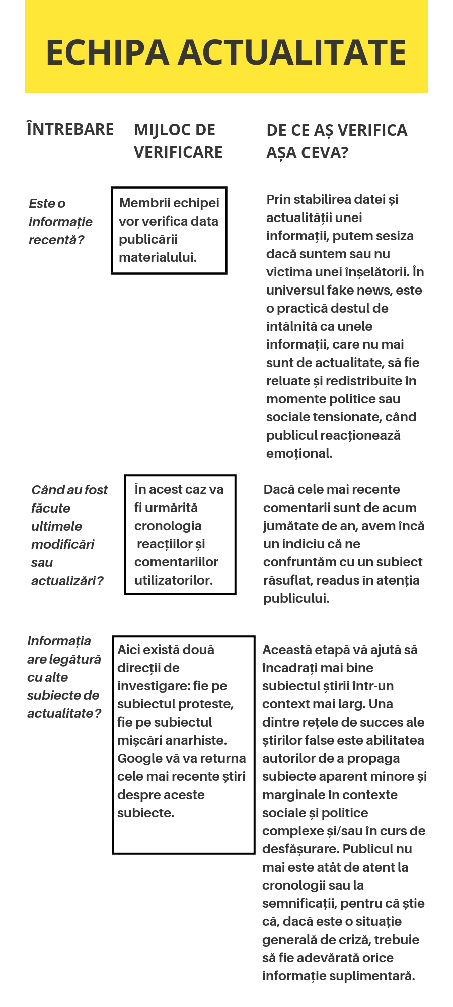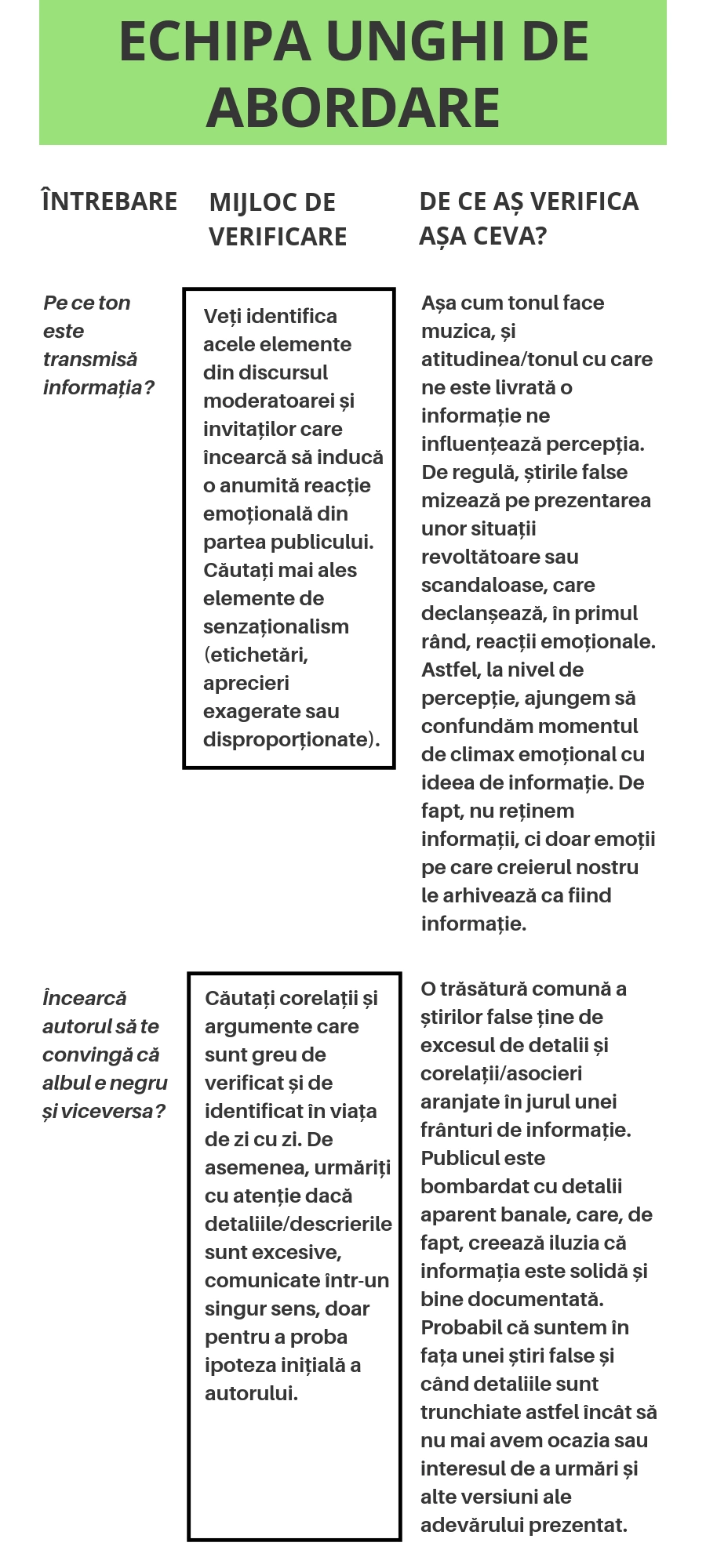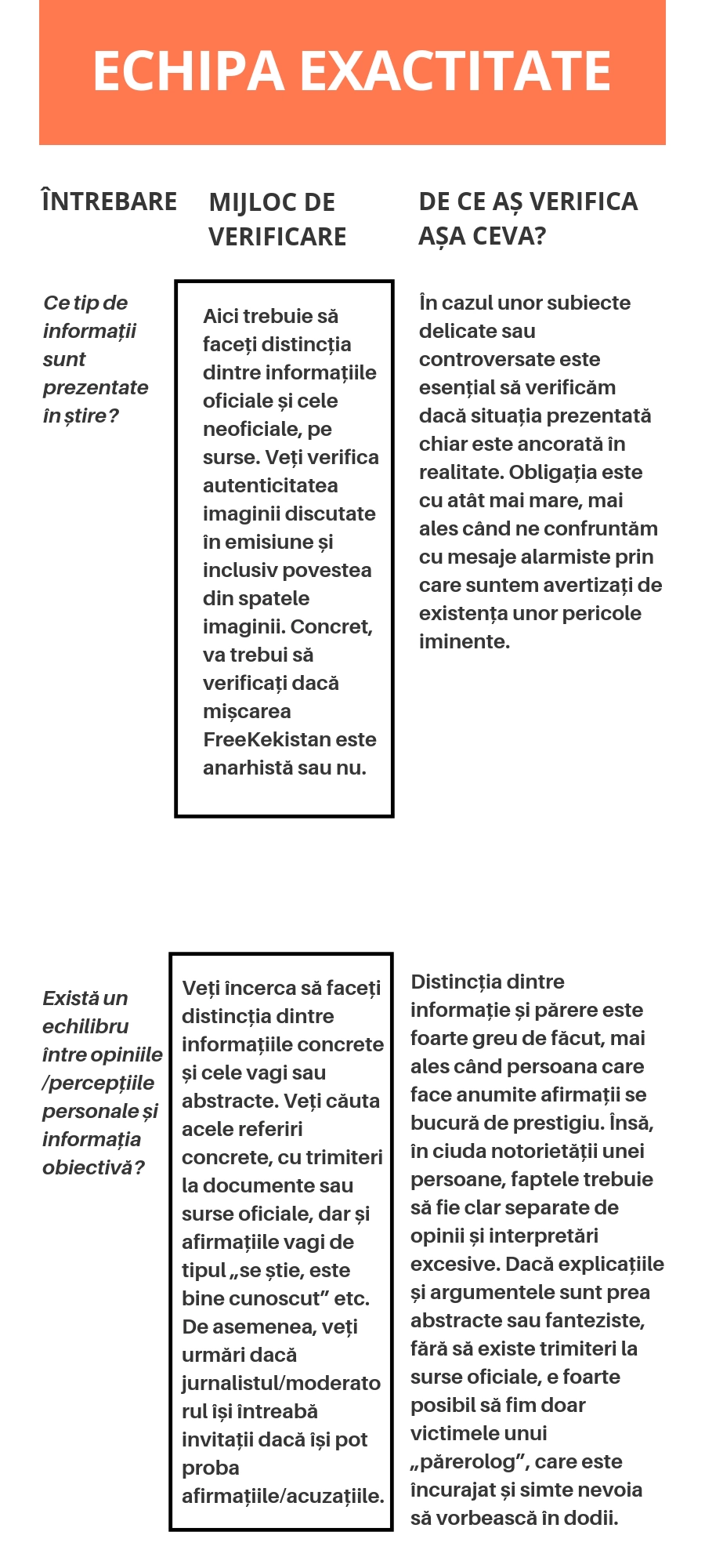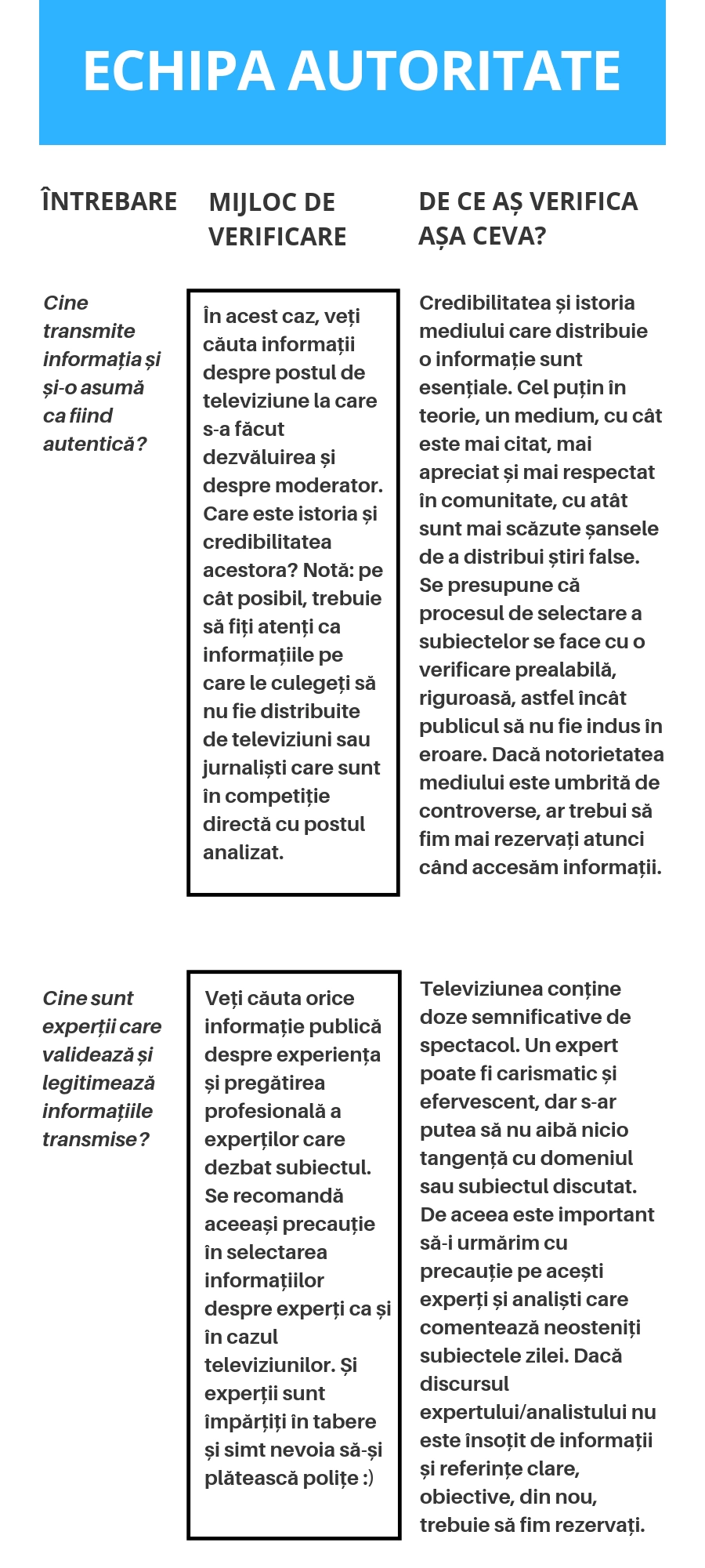 2. Pentru analiza „la rece”, vă veți împărți în patru echipe de investigații speciale: echipa actualitate, echipa exactitate, echipa autoritate și echipa unghi de abordare. Fiecare echipă va trebui să investigheze și să răspundă punctual unor întrebări specifice.