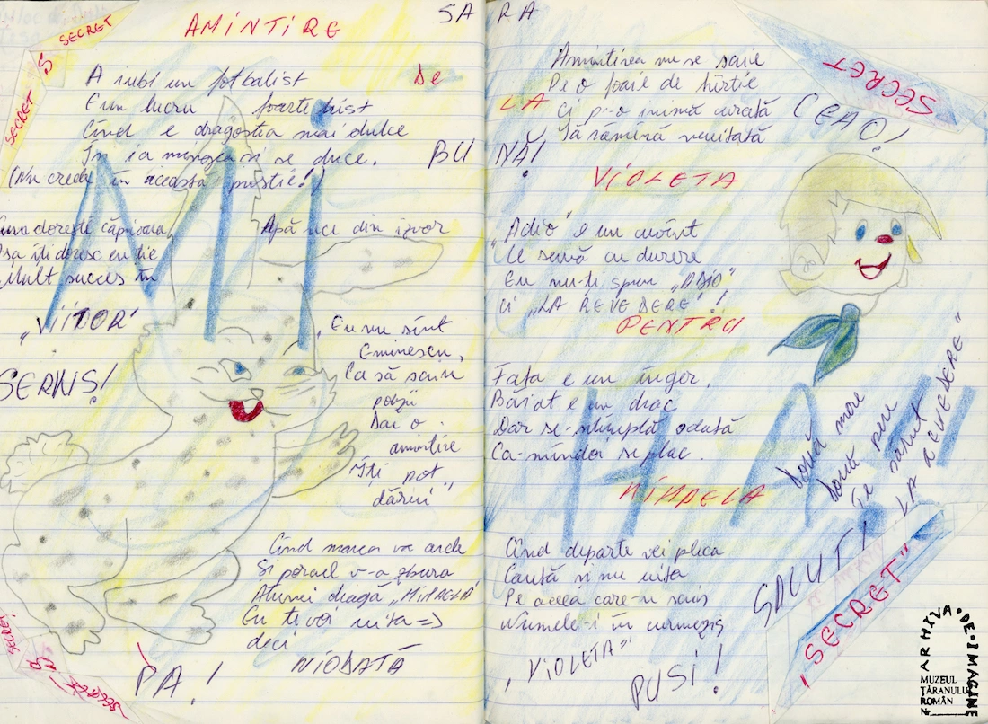 Sunt oracolele anilor ‘90, când lumea se deschide un pic, iar preocupările și fascinațiile se schimbă. Caietele astea, majoritatea cu coperți foarte colorate, au înăuntru mai puține poze și mai multe desene. Deja nu mai era o mare chestie să ai reviste sau pachete de țigări străine.