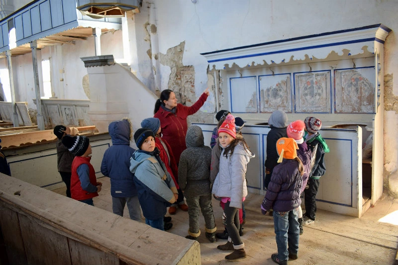 Înăuntru e răcoare și umezeală. Miroase a mucegai. Pereții sunt spoiți în culoarea cerului, iar pe jos, o dușumea veche, prăfuită. Băncile de rugăciune sunt la locul lor. „Lipsesc zece”, ne arată Alina găurile în care erau fixate. „Au dispărut înainte de a ajunge noi aici. Și bănuim că tocmai cei care aveau grijă de biserică le-au luat. Am făcut plângere la poliție și am cerut să fie anchetat cazul ca furt de patrimoniu. Poliția a început cercetarea ca pentru un furt de lemn și bineînțeles că nu s-a rezolvat nimic.”